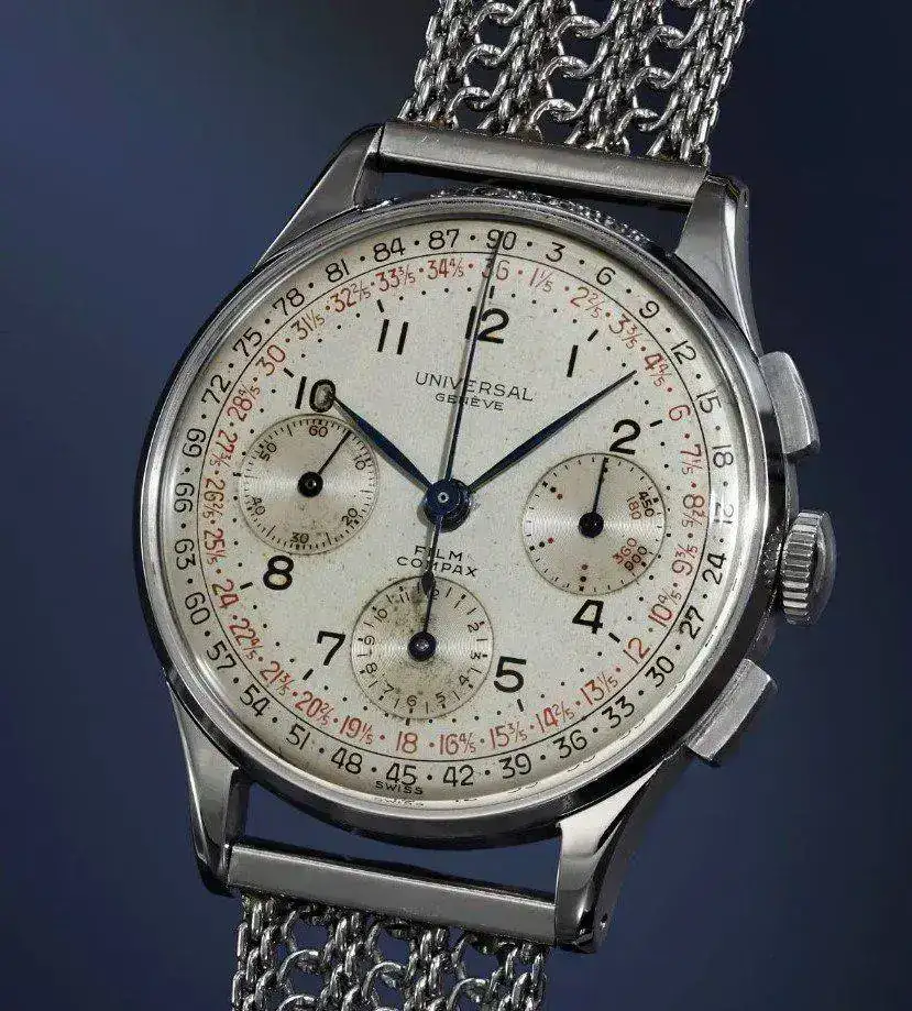 Incluso un curiosísimo Film-Compax que, según Fratello Watches, servía para medir los pies de película por segundo: la escala en rojo para película de 16mm y la negra para película de 35mm... Sólo se conoce la existencia de siete ejemplares.