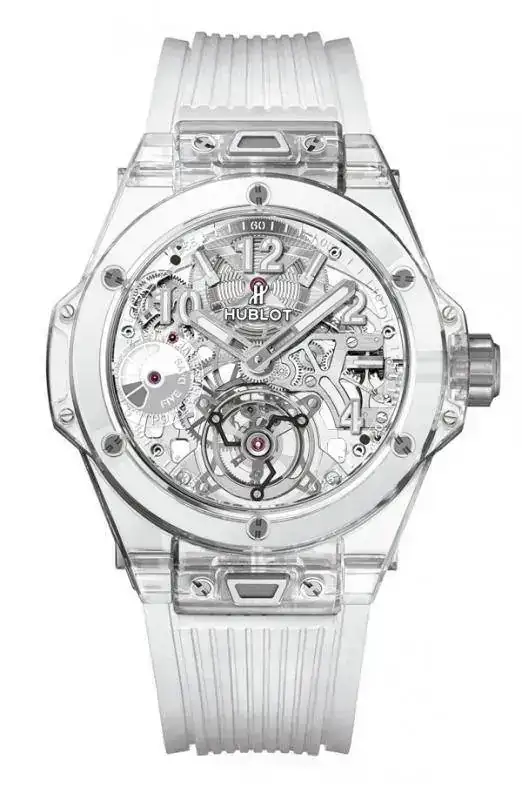 Este tourbillon manufactura, del que se han fabricado tan solo 99 ejemplares, representa unnuevo avance en la exploración técnica y estética del zafiro. Además de su caja de 45 mm dediámetro tallada en un bloque de zafiro, el pasador del tourbillon también ha sido diseñado eneste material prácticamente indestructible y realmente complicado de trabajar. Fusión declaridad y pureza, en la muñeca, el Big Bang Sapphire Tourbillon se vuelve invisible con unapulsera de caucho transparente estructurado y alineado.