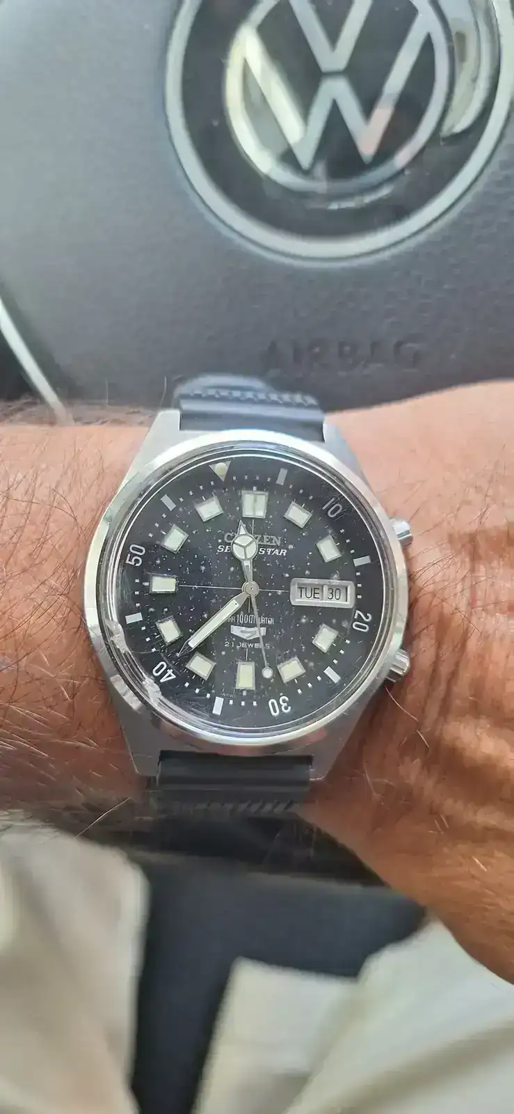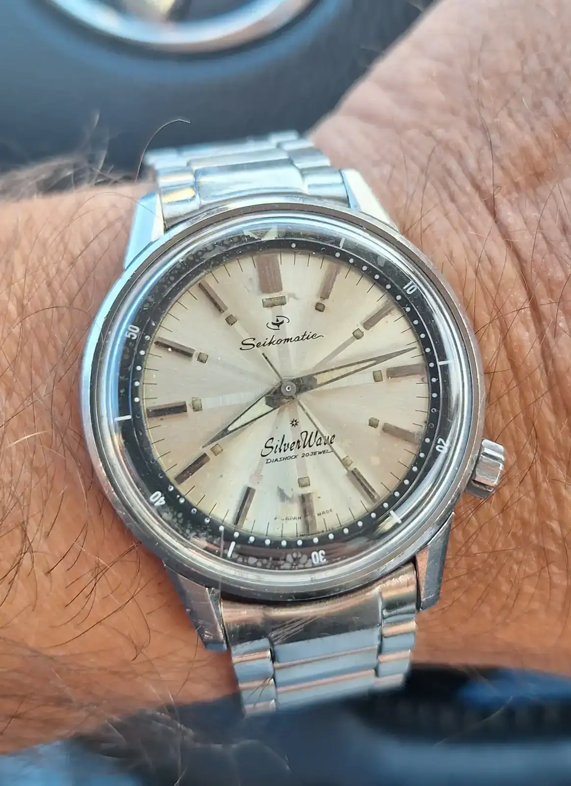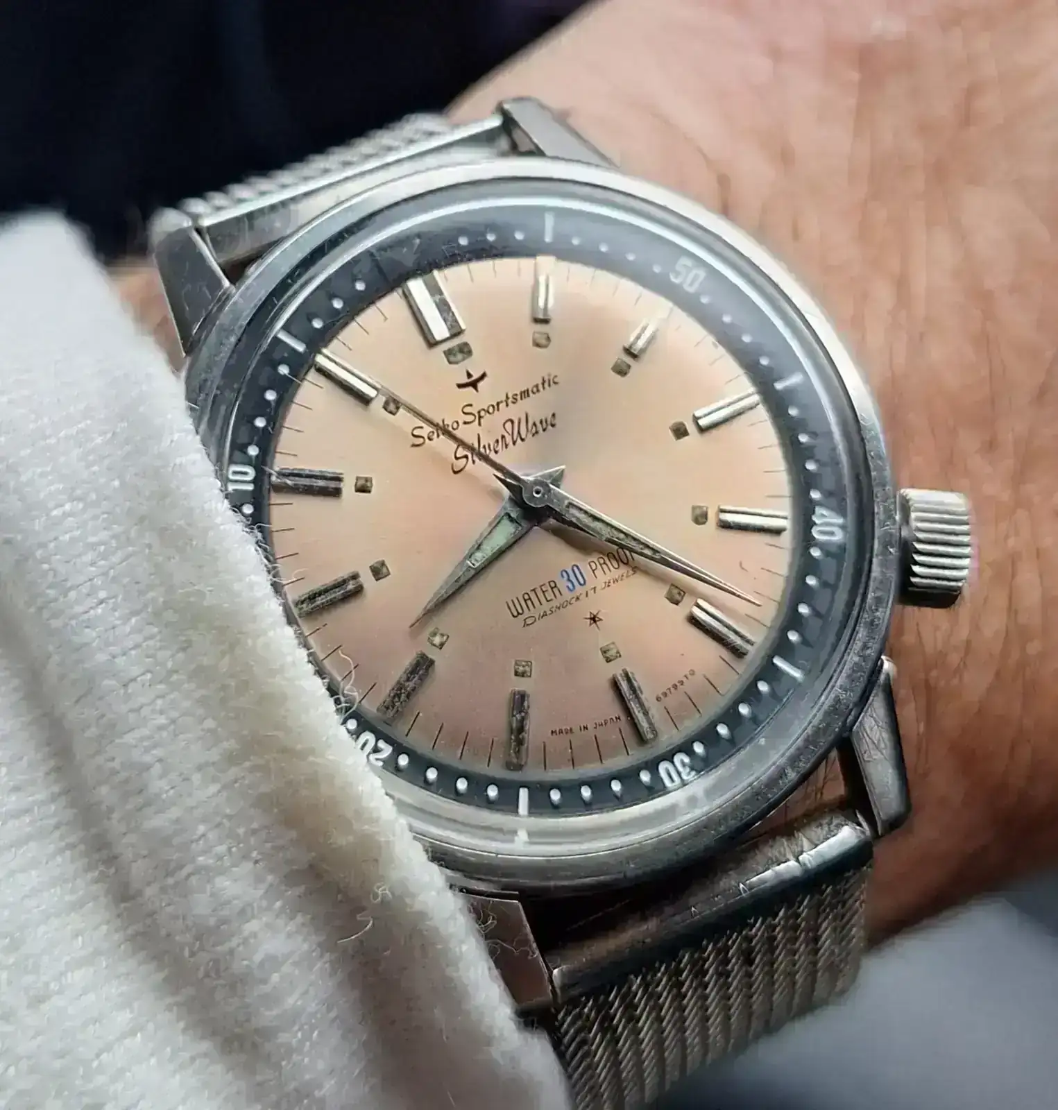 El segundo es este sportmatic silverwave de los años 60 , toda accionado mediante la corona , muy grande y manipulable situada a las 4 , como curiosidad la escala es una cuenta regresiva , cosa de los primeros relojes de buceo .