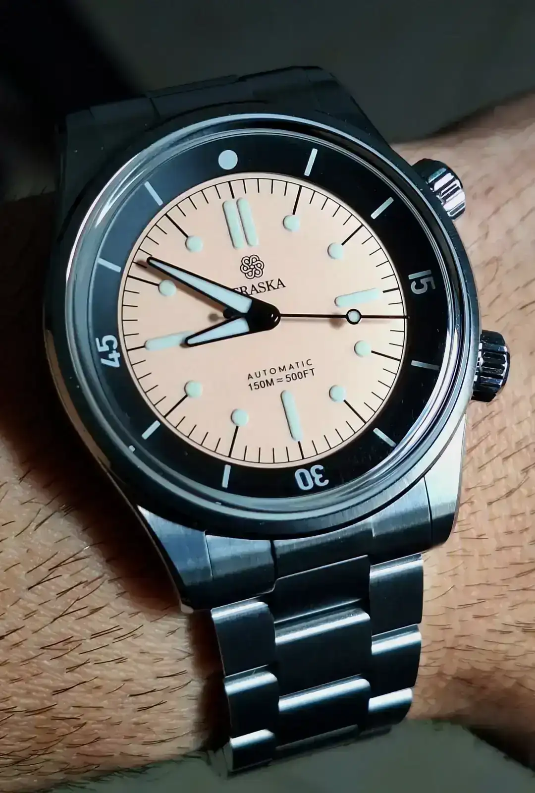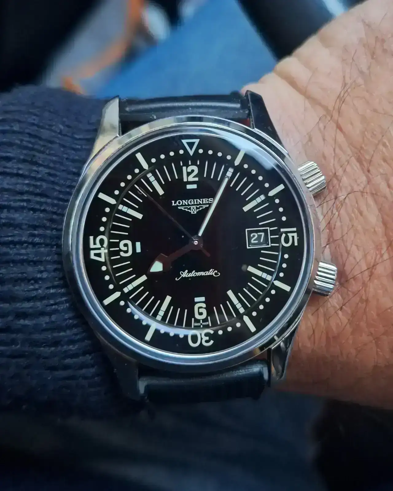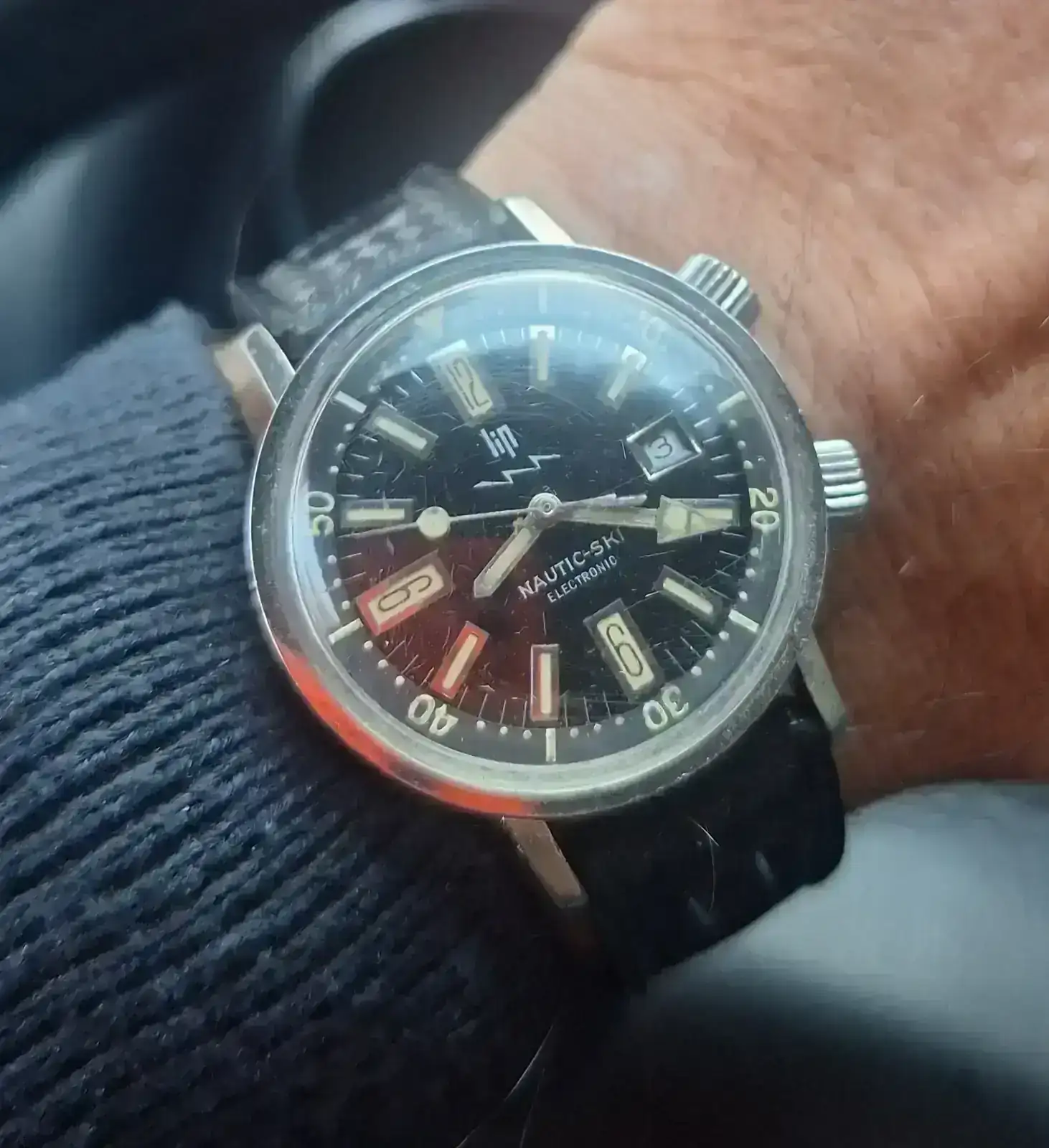 El segundo es este sportmatic silverwave de los años 60 , toda accionado mediante la corona , muy grande y manipulable situada a las 4 , como curiosidad la escala es una cuenta regresiva , cosa de los primeros relojes de buceo .