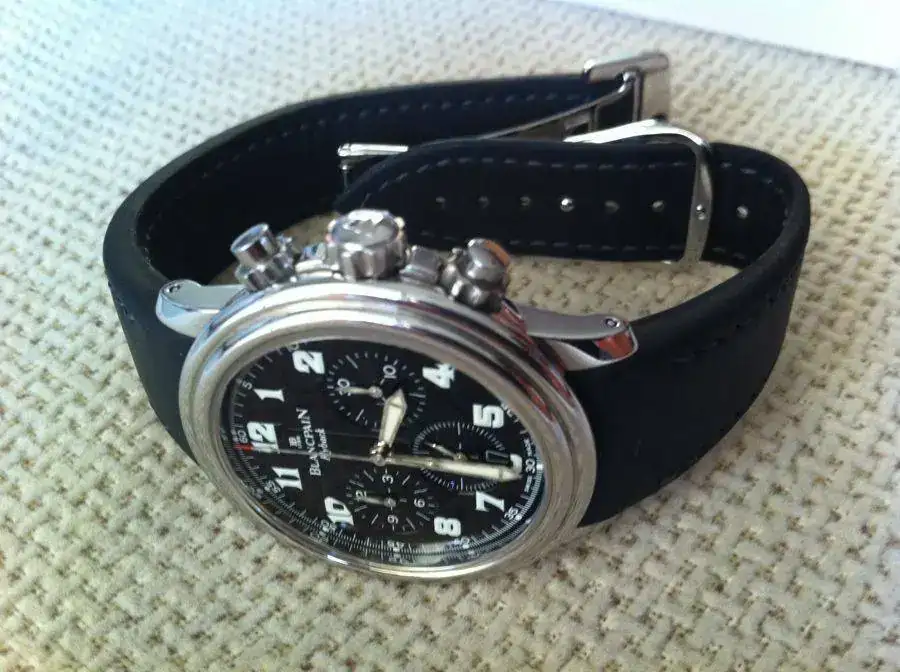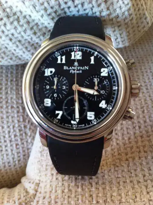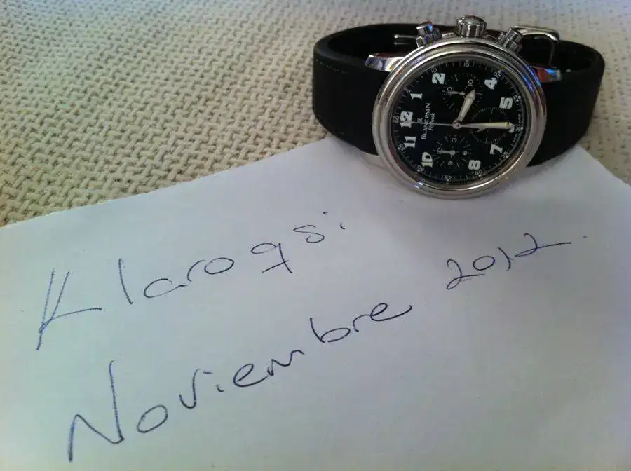 Ahora le toca a este Blancpain Flyback Chrono ref. 2185F-1130-64B, automático, en acero, con correa de cuero (y un tacto un tanto especial) y cierre desplegable. El año está por confirmar pero es aprox. del 2005. Calibre F185 y 37 rubíes. Cristal de zafiro. Cronógrafo con función Flyback, agujas luminosas y todas las coronas atornilladas.