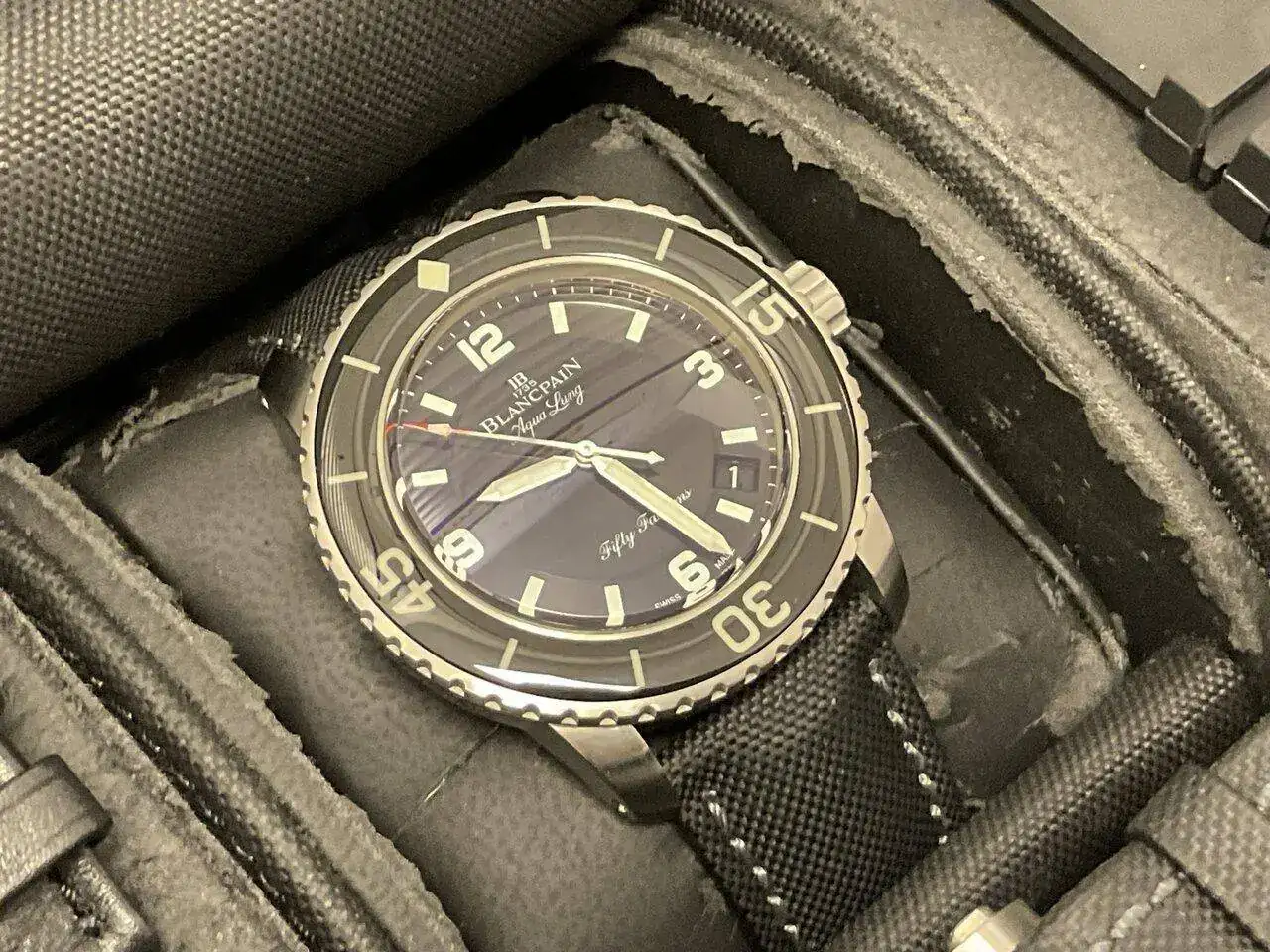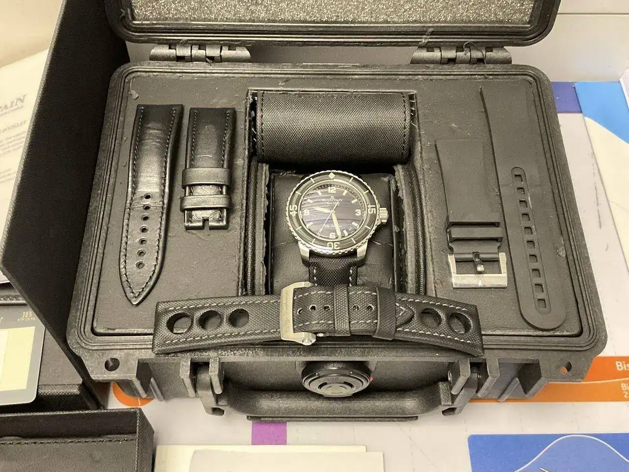 Brazalete: Original tela de barco con agujeros tipo Racing con cierre deployante con muy poco uso. Aporto también correa de vacuno negra original poco usada y caucho más tela de barco NO original. Esta ultima es la que podéis ver en las fotos ya que va montada en el reloj. Se adjunta kit original BP para cambios de correa. En tienda supera los 1000 euros holgadamente. Tiene tornillos de sobra, pasadores, soporte para la caja y destornilladores especiales. Eso si, ignoro si completo del todo ya que así me llegó a mi y salvo cambiar correa no hice uso de el.