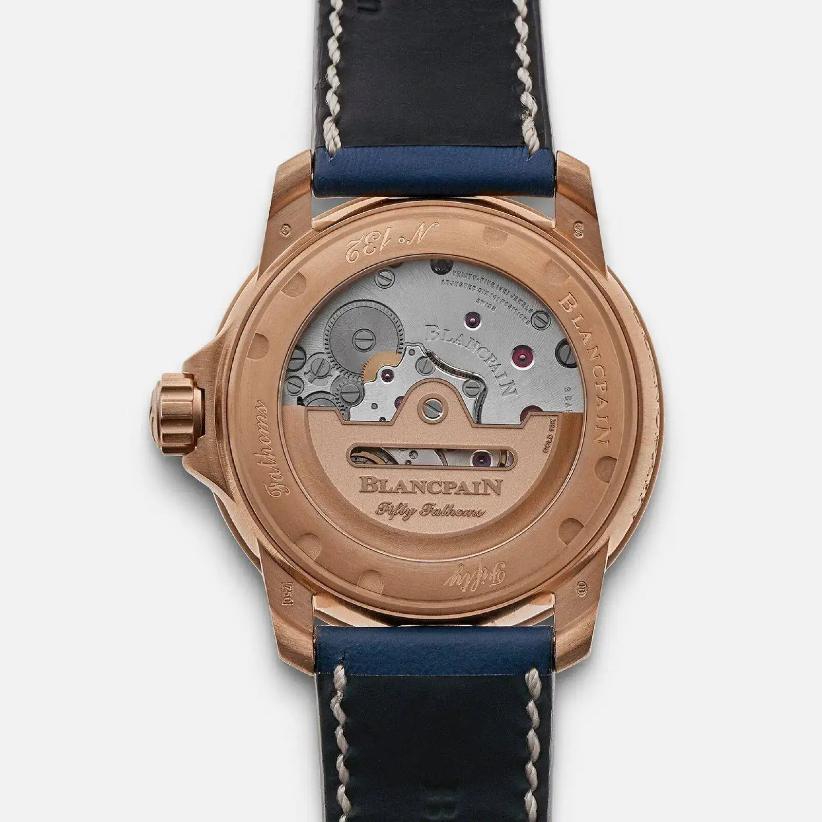 Es el Fifty Fathoms Automatique estándar, prácticamente idéntico al lanzado cuando la marca relanzó el Fifty Fathoms como una colección de producción completa en 2007, excepto que está ejecutado en una caja sólida de oro rojo de 18k con una esfera de cerámica azul brillante. Al oro rojo se le ha dado un acabado cepillado, en contraste con los diseños de oro pulido más populares, lo que resulta en una versión discreta de lo que normalmente sería un diseño extravagante. Este reloj representa la primera vez que Blancpain utiliza cerámica como material de esfera en toda su historia.