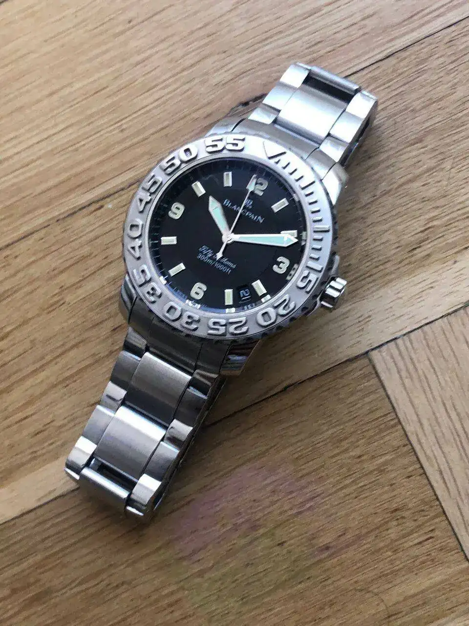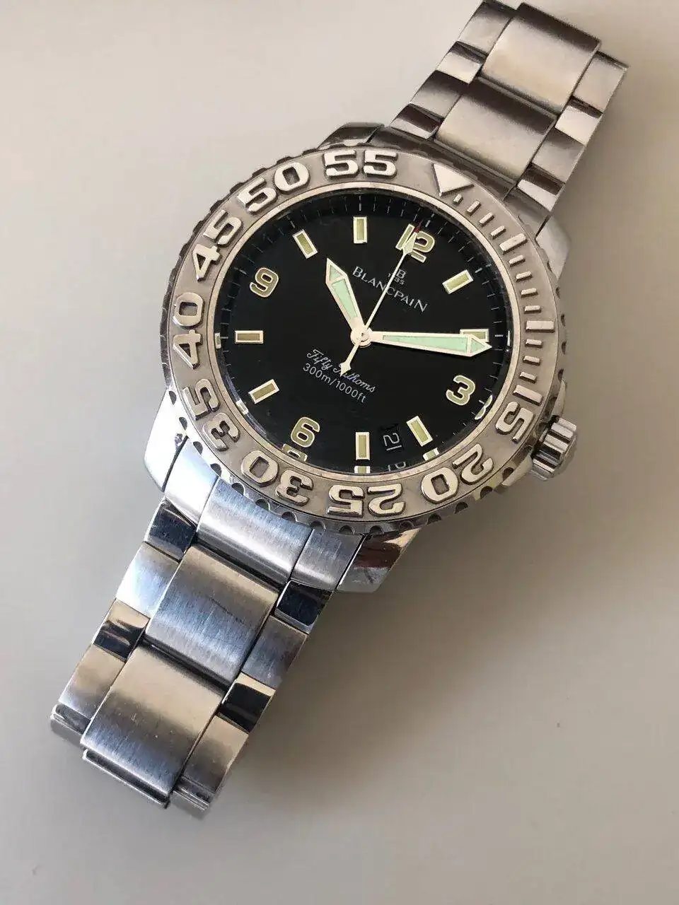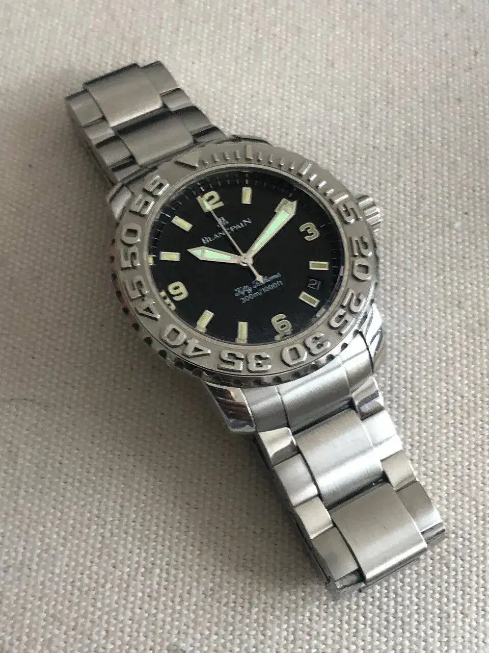 Blancpain revivió -bueno, fue revivido por Jean Claude Biver y Jaques Piguet- en 1982, pero los ilustres modelos Fifty Fathoms tardaron hasta 1997 en volver a la vida. Los nuevos dueños de la marca no pensaron que Fifty Fathoms encajara muy bien con la imagen de sus ideas con Blancpain. Entonces, solo unos 15 años después, ellos, de manera algo silenciosa, introdujeron nuevamente este reloj en la familia. Este es un ejemplar de la primera serie.