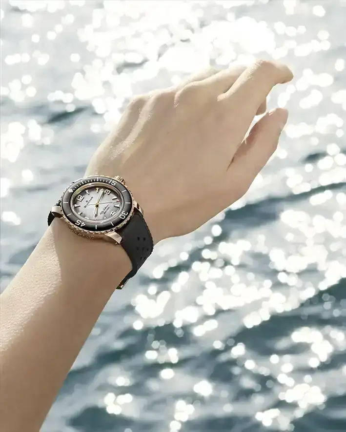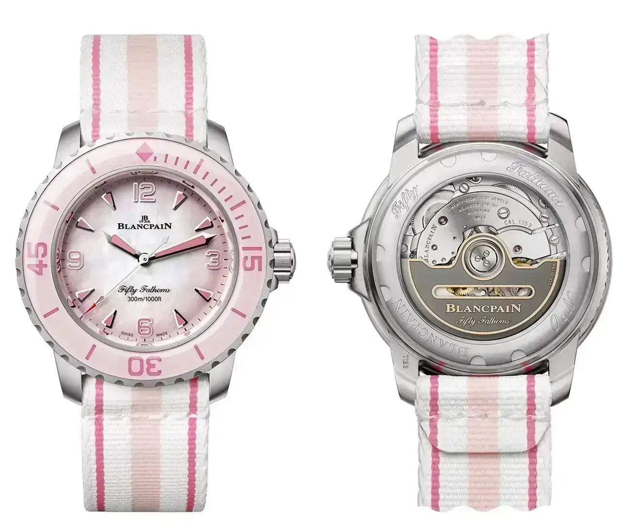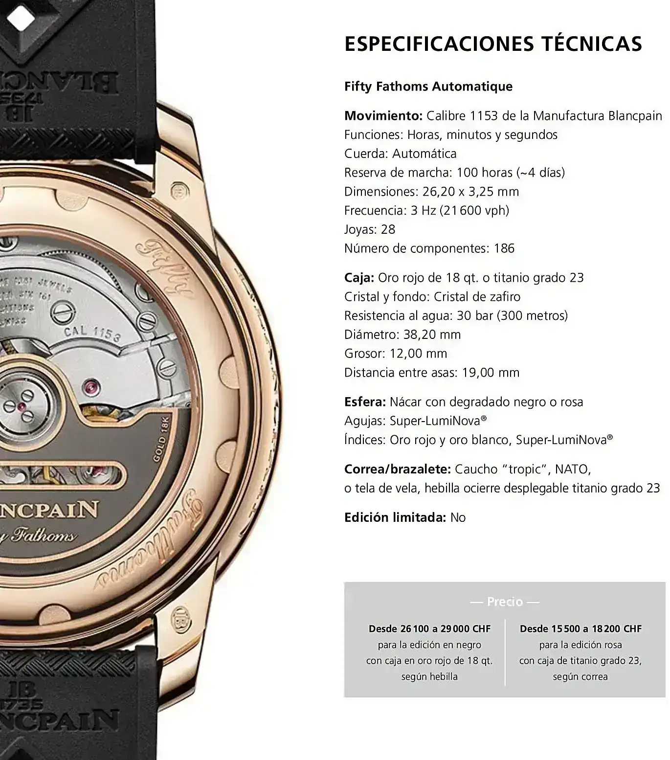 Según la nota de prensa, "Blancpain presenta dos nuevos relojes Fifty Fathoms Automatique para mujer, incorporando por primera vez una caja de 38 mm a la icónica línea. Negro intenso, rosa alegre: una versión femenina de la leyenda. Un capítulo para la mujer en la historia de lo profundo, lo audaz y lo inconfundiblemente suyo."