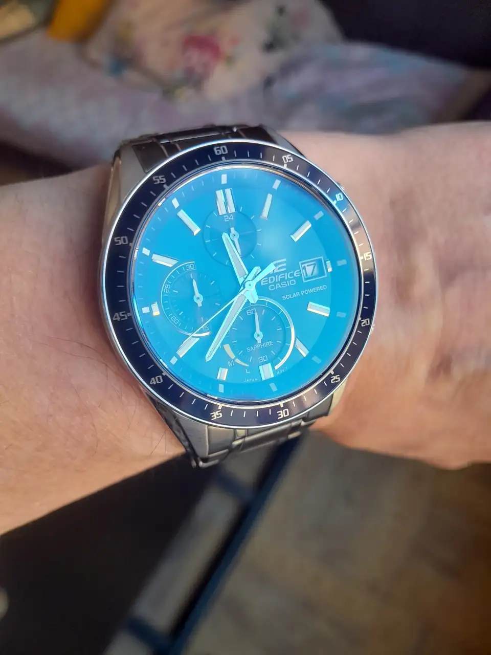 Trampa muy bien hecha.He hecho trampa, el reloj es azul, pero el azul que sale en la foto es el reflejo del cielo que entra por mi balcón...