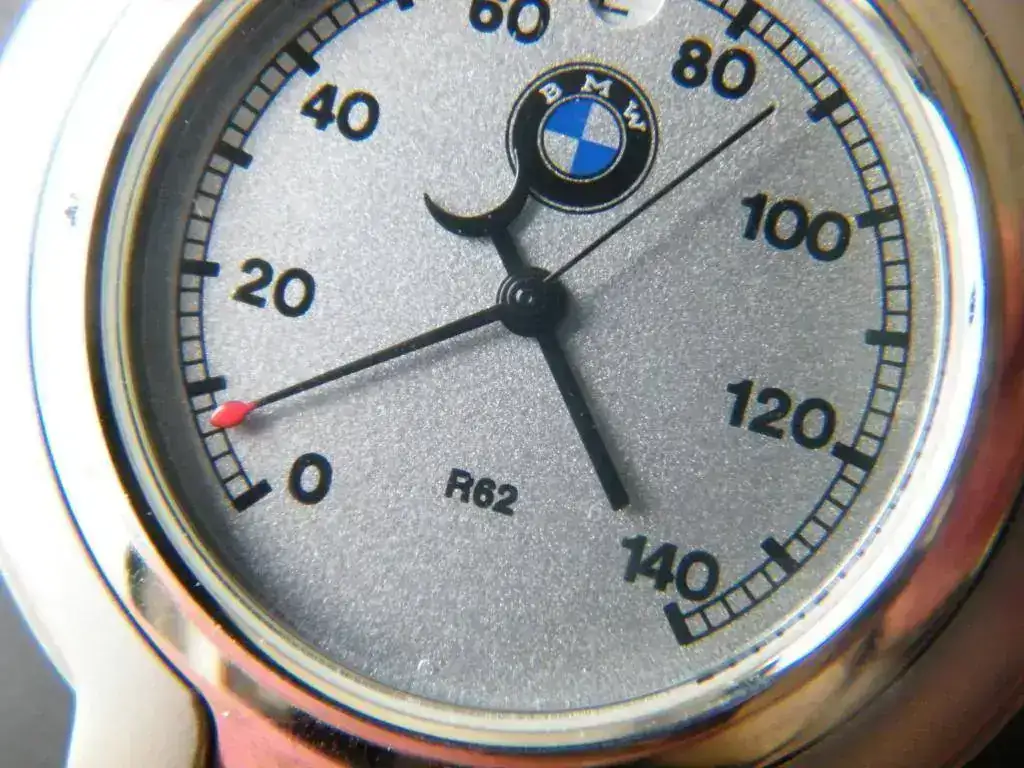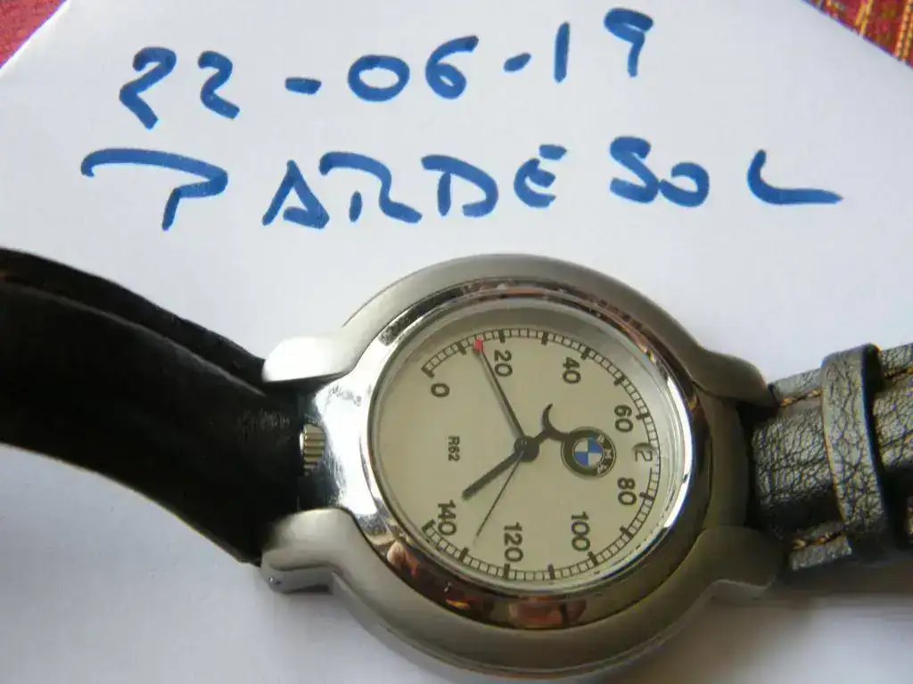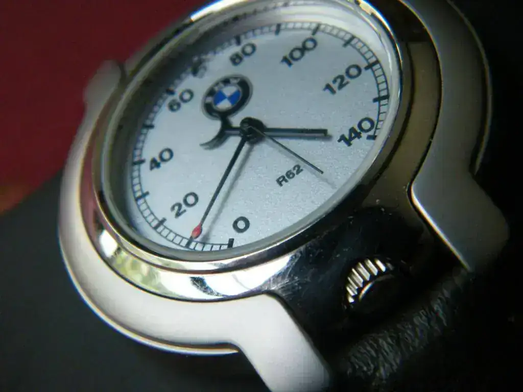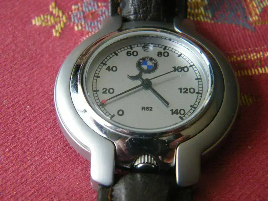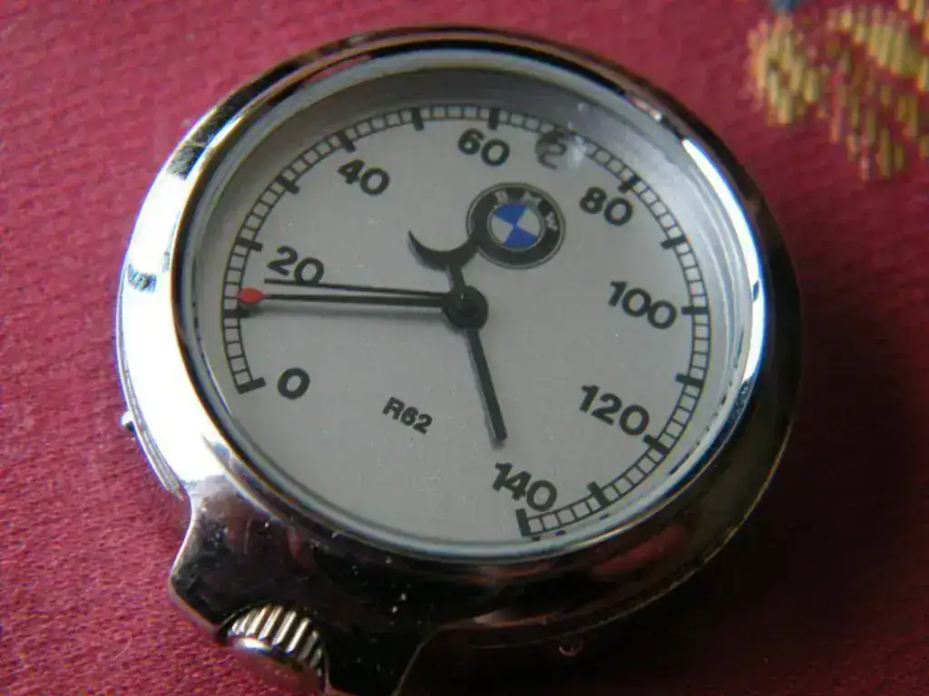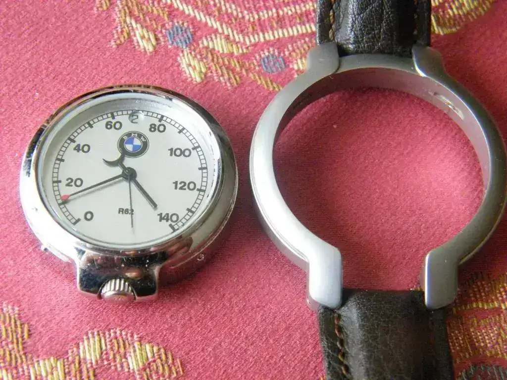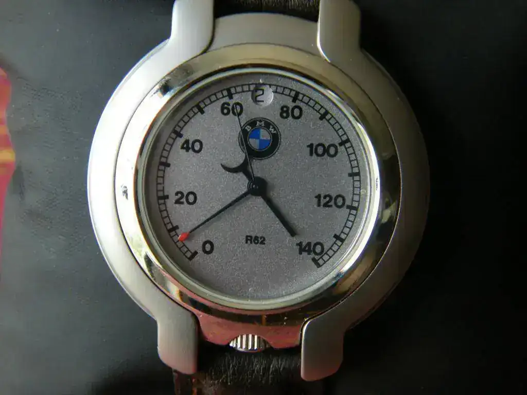 Reloj BMW modelo R 62. Se trata de un reloj de la conocida marca de automóviles bávara, que homenajea a la motocicleta R 62. Monta un calibre automático Eta 2824 y la esfera reproduce el velocímetro de la R 62. Lo compré para iniciar una colección temática BMW y he abandonado la idea. El reloj puede desmontarse del brazalete y se convierte en un reloj de sobremesa. Su estado es usado sin defectos o arañazos dignos de mención, tal y como se ve en las imágenes.
