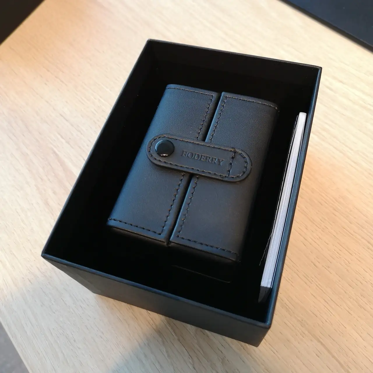 - Dentro viene una segunda caja de presentación, correcta, de carton oscuro con el logo plateado. En su interior encontramos la caja del reloj en sí, tipo estuche de viaje de piel sintética, y la documentación.