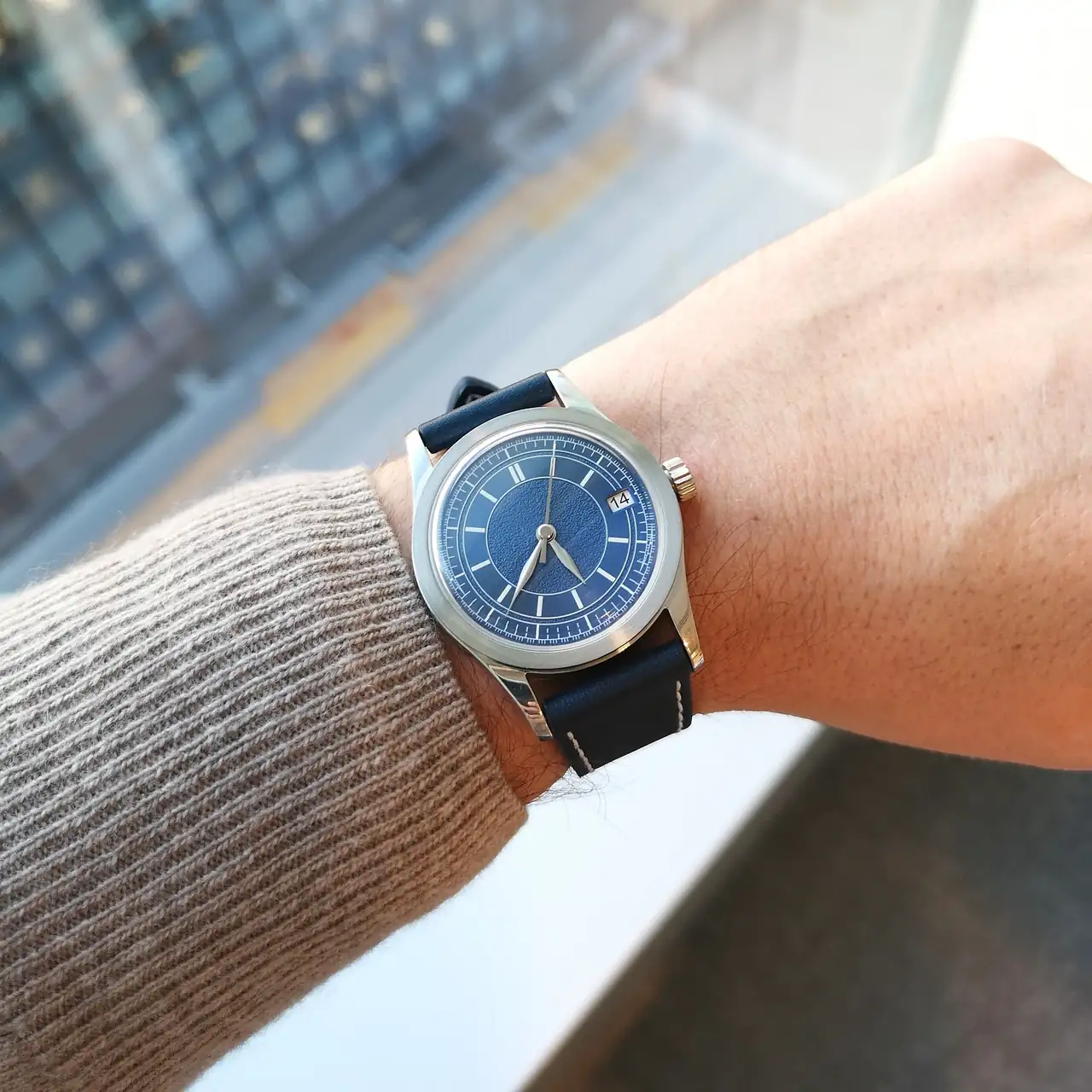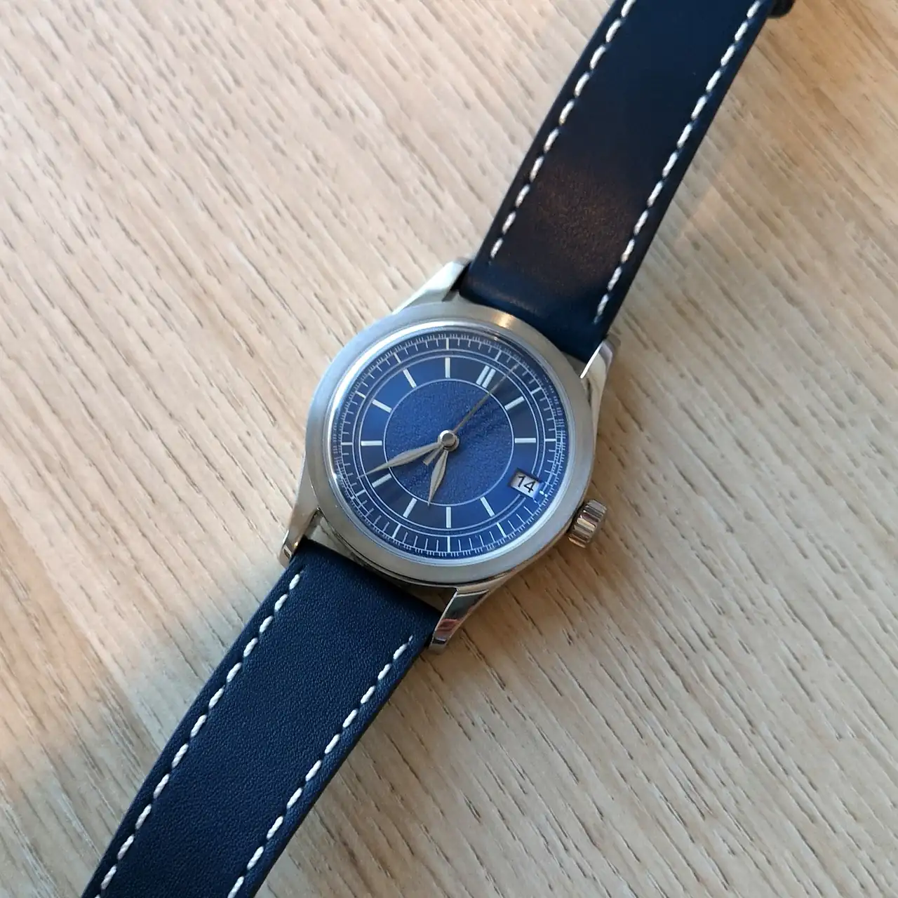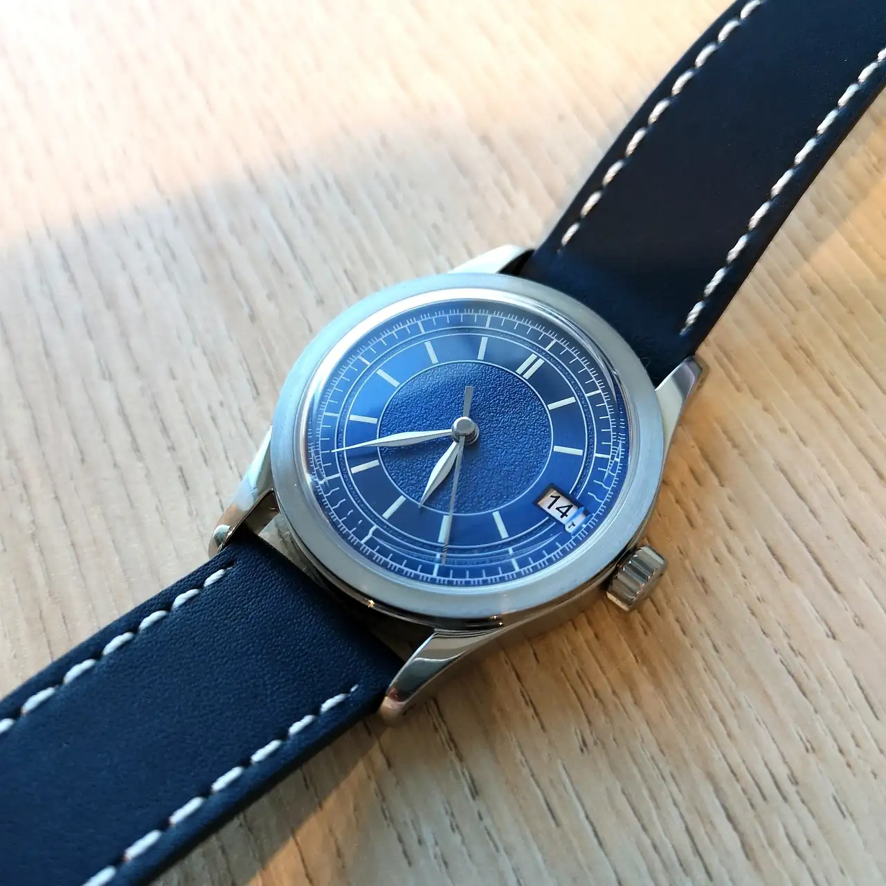 - La correa es de 21mm, de piel azul oscura con pespunte blanco y calidad mejorable.