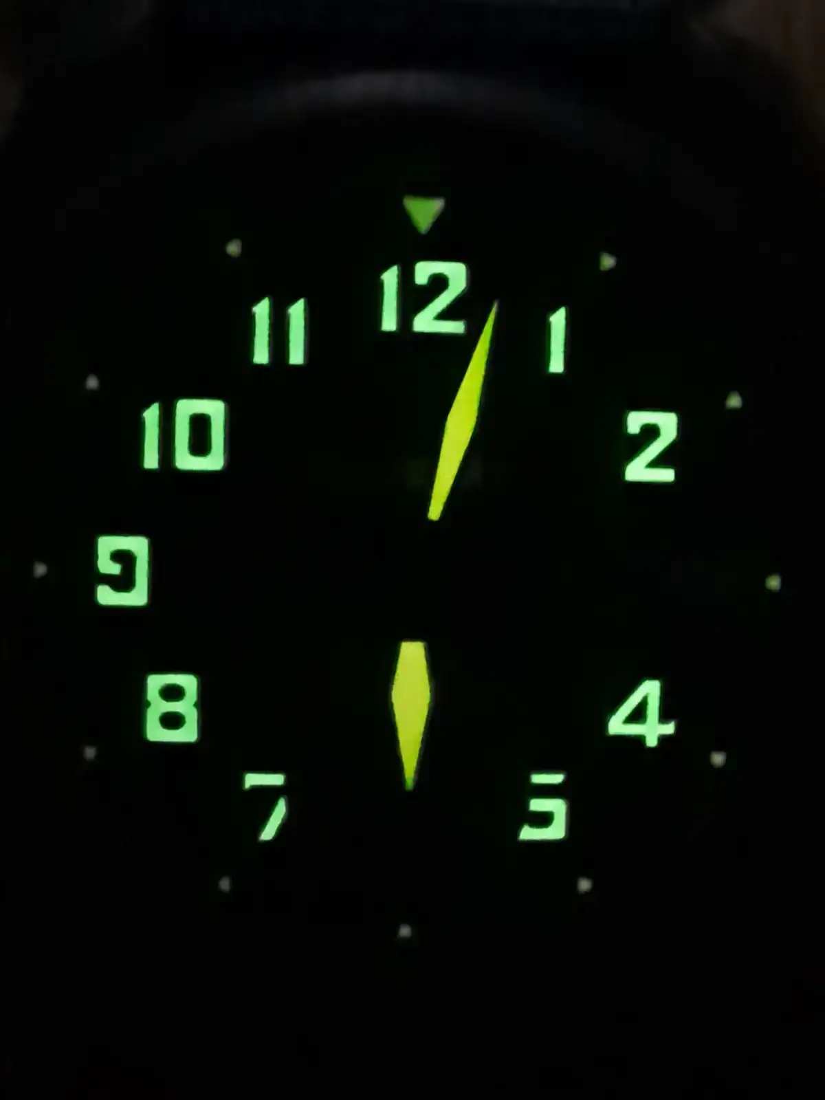El lume tiene un brillo potente y homogéneo, las cifras se leen con claridad y la forma ancha de las agujas permite distinguirlas al instante.