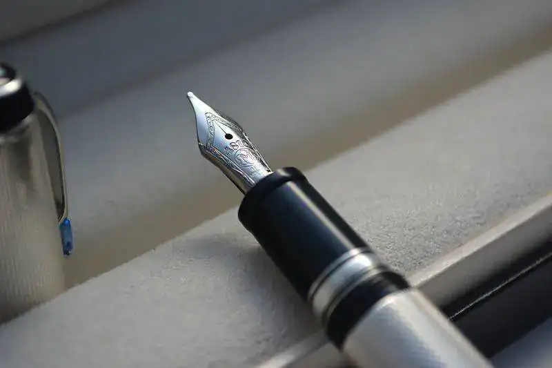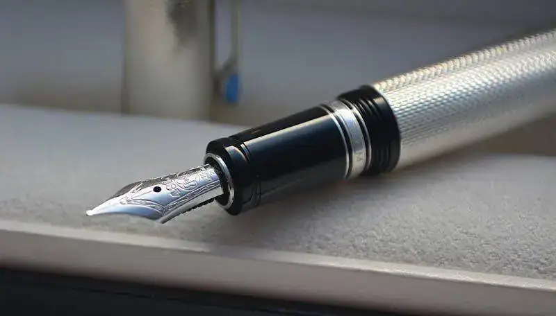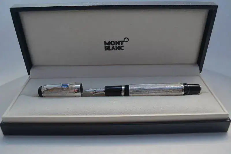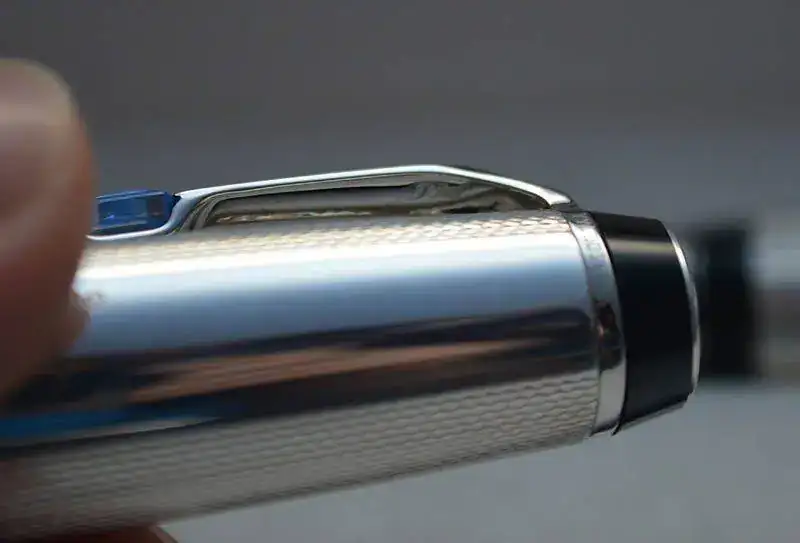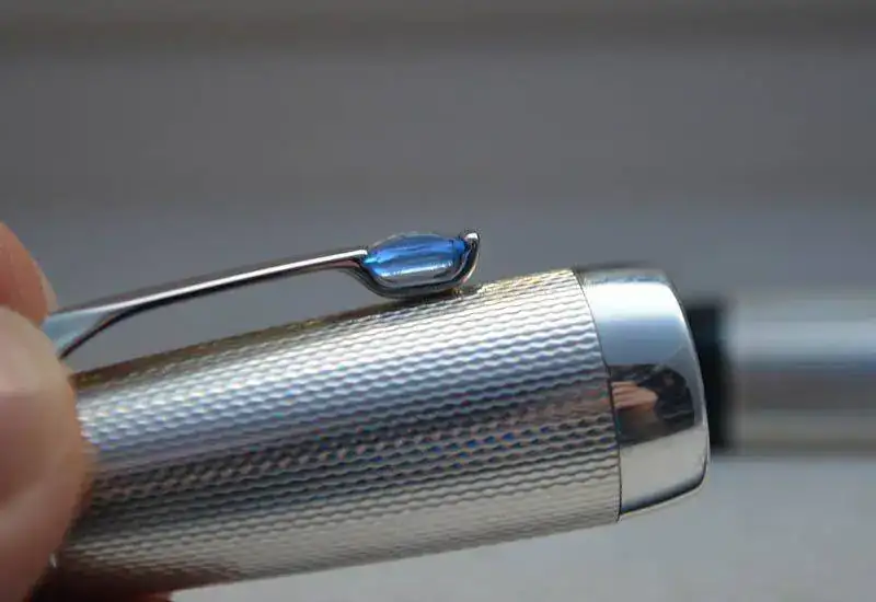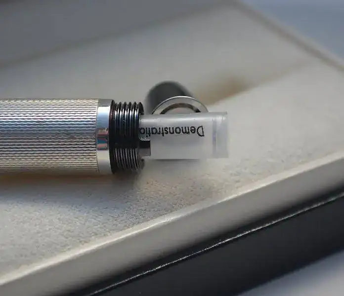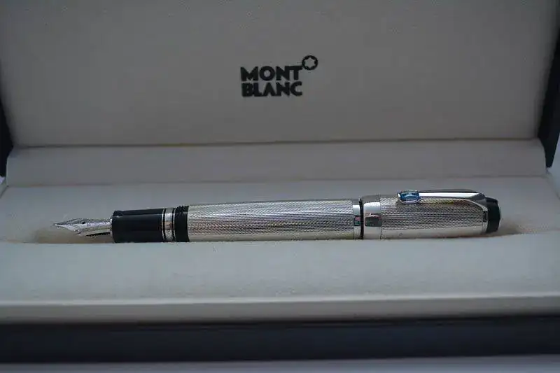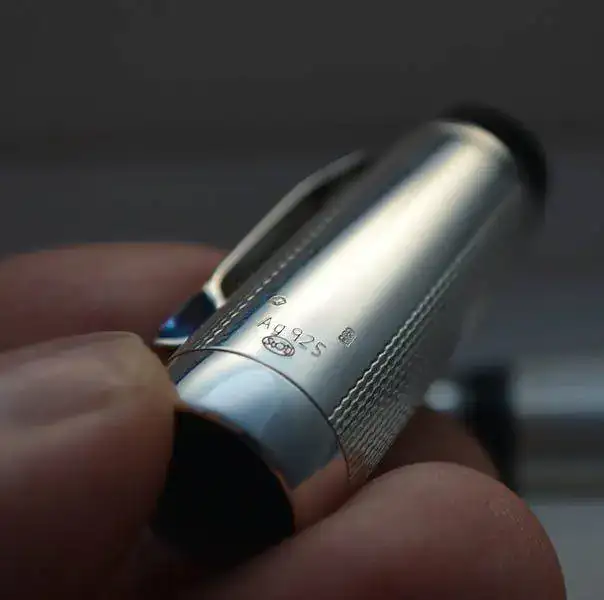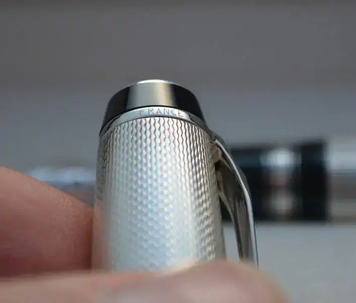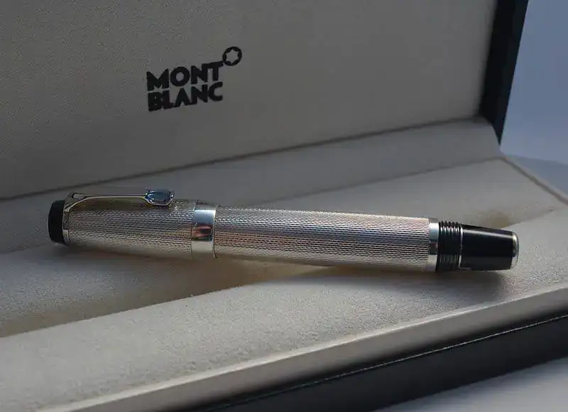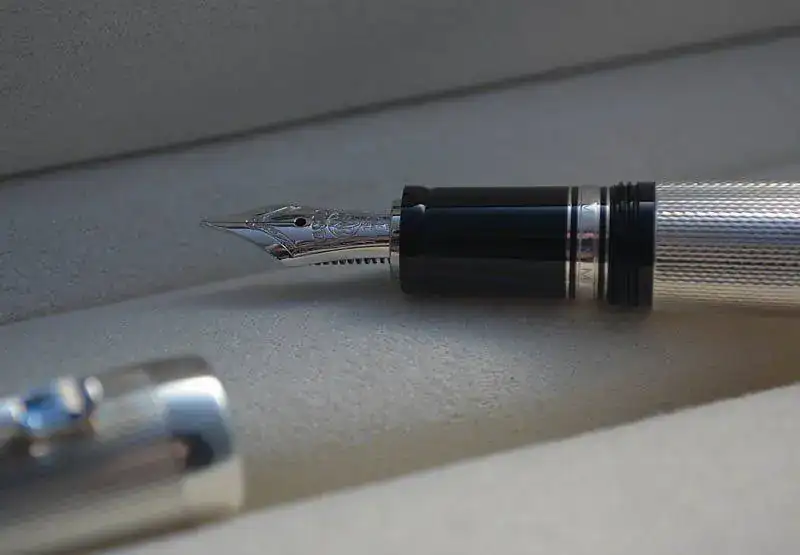 Los acabados van en rodio en las partes que no son plata, incluyendo el plumín, que es un Medio en este caso, suave y firme IR:4, con alimentador de plástico.
