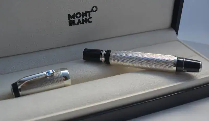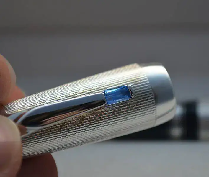 Se trata de una Montblanc de la serie Boheme, retráctil, en acabado plata con piedra azul, probablemente un zafiro sintético.