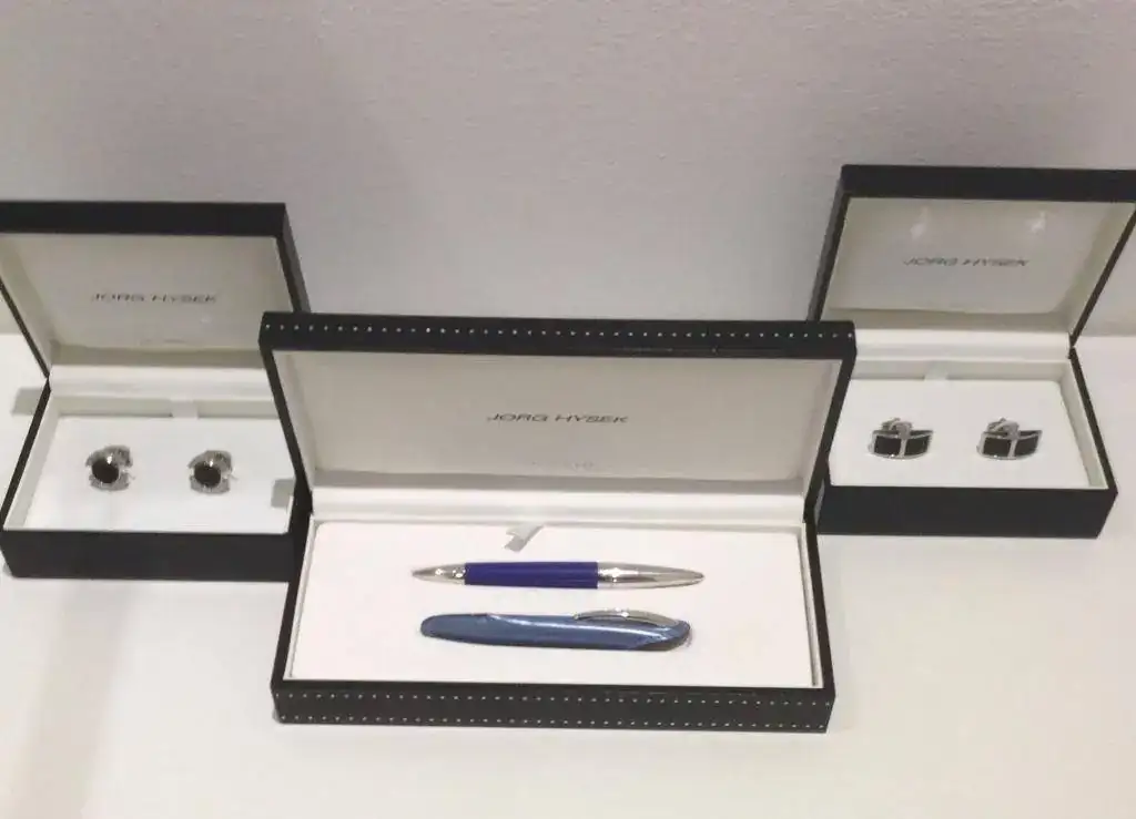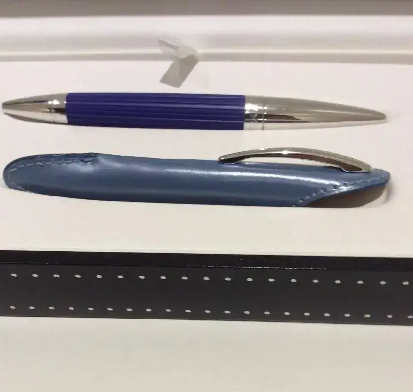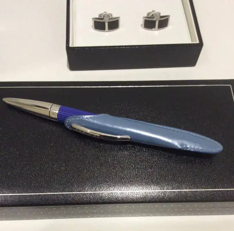 De acero con cuerpo azul,y funda de piel azul,con estuche. 200€ envío gratis a toda España. Los gemelos redondos o rectangulares a 210€ c.u.