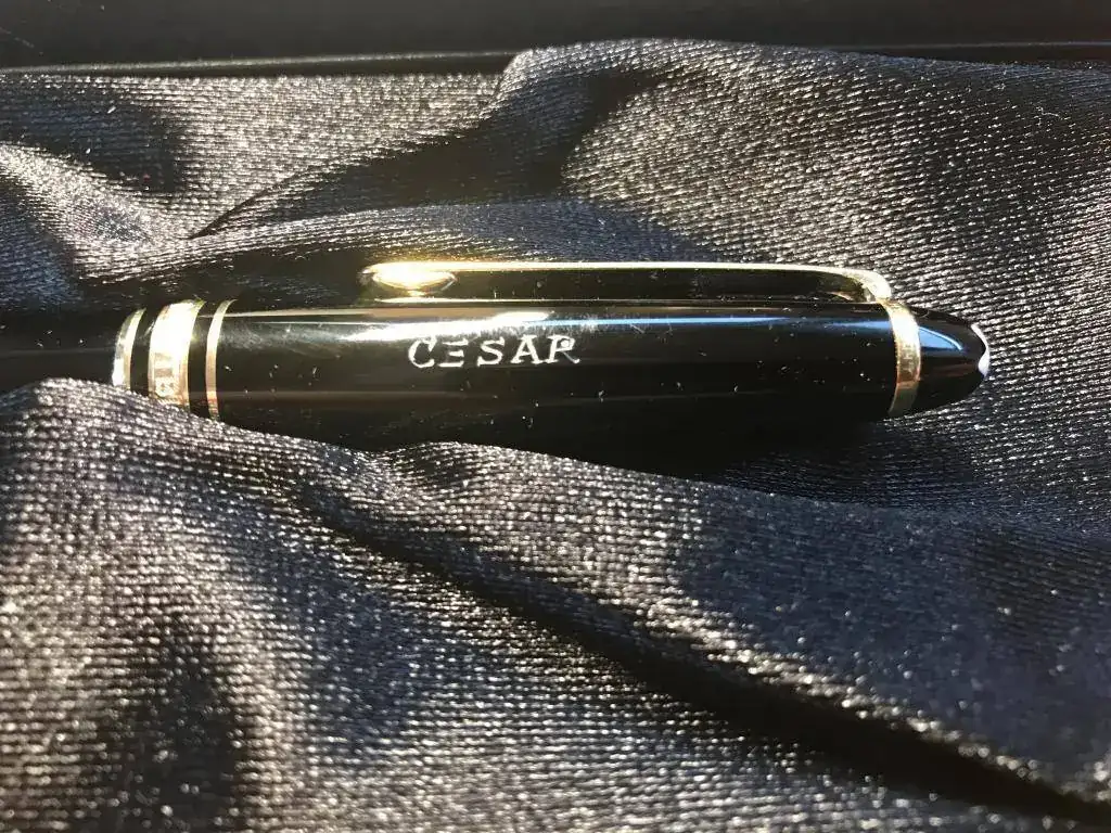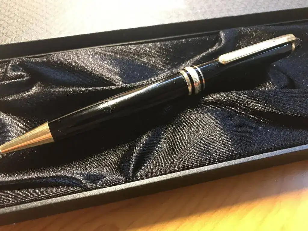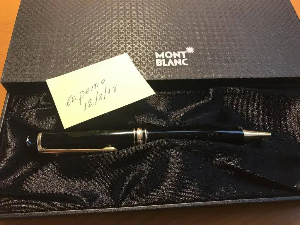 Bolígrafo Montblanc Meisterstück dorado, resina negra, el boli es usado y grabado, por ese motivo le pongo un precio de 65€ envío por correo ordinario , lleva caja y sin recambio