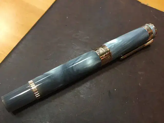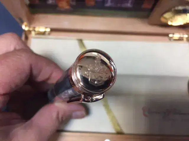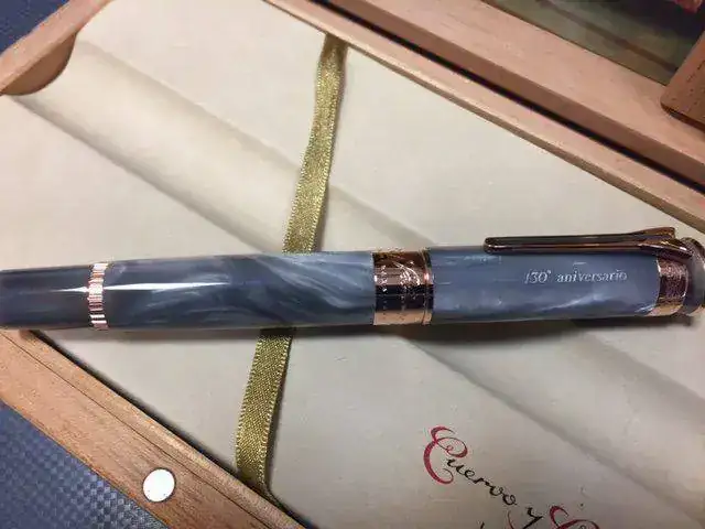Cada pieza es distinta, puesto que el nácar de color grisaceo con el que está elaborada no es homogéneo. El blasón de Cuervo y Sobrinos está grabado en el capuchón, y los detalles de estilo art déco presentan decoraciones chapadas en oro rosa de una calidad de acabados excelente. Incluye como no el maravilloso estuche tipico de la marca. El estado es como nuevo ya que no se ha usado nunca, el recambio es un Omas que se tendrá que sustituir ya que no funciona por el tiempo que ha estado sin usarse.