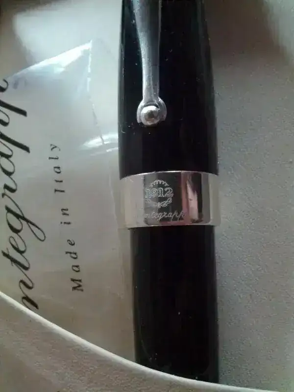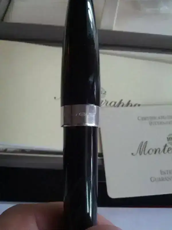 -Cuerpo y capuchon de celuloide con unos efectos negros y grises impresionantes, adornos de plata maciza de 925.