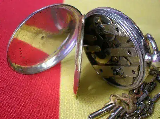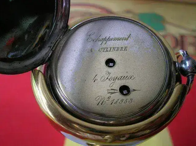 Monta calibre de cuerda manual con llaves, de cilindro con cuatro rubíes, mantenido y funcionando de forma perfecta.