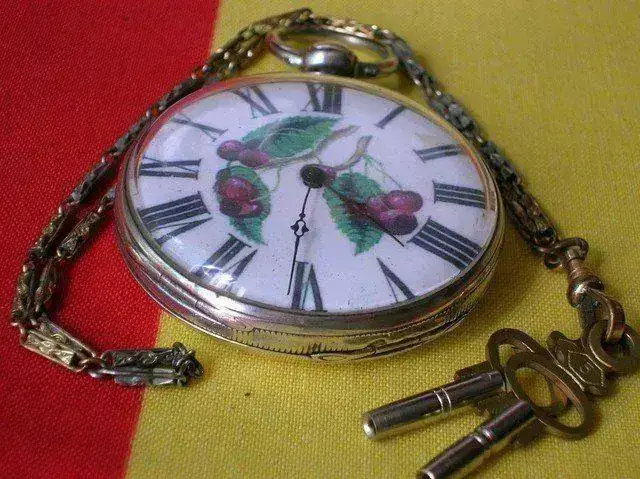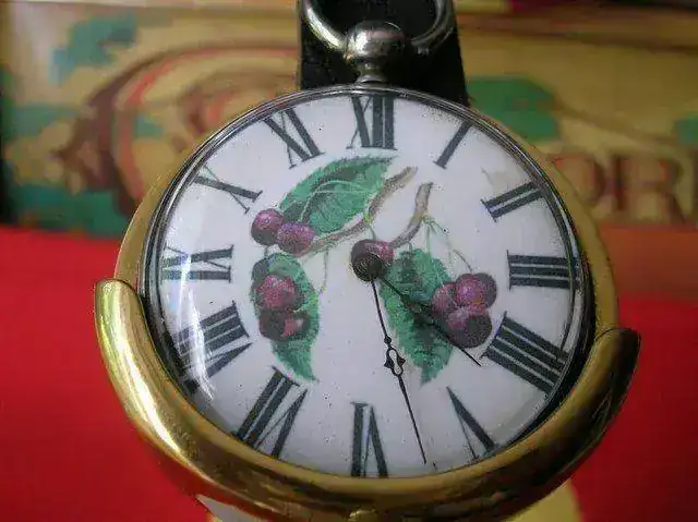 Lo mas interesante del reloj, es su esfera en porcelana y muy buen estado, sin rayas ni pelos, con una pequeña mancha entre la una y las dos, y con una decoración muy bonita de hojas y uvas.