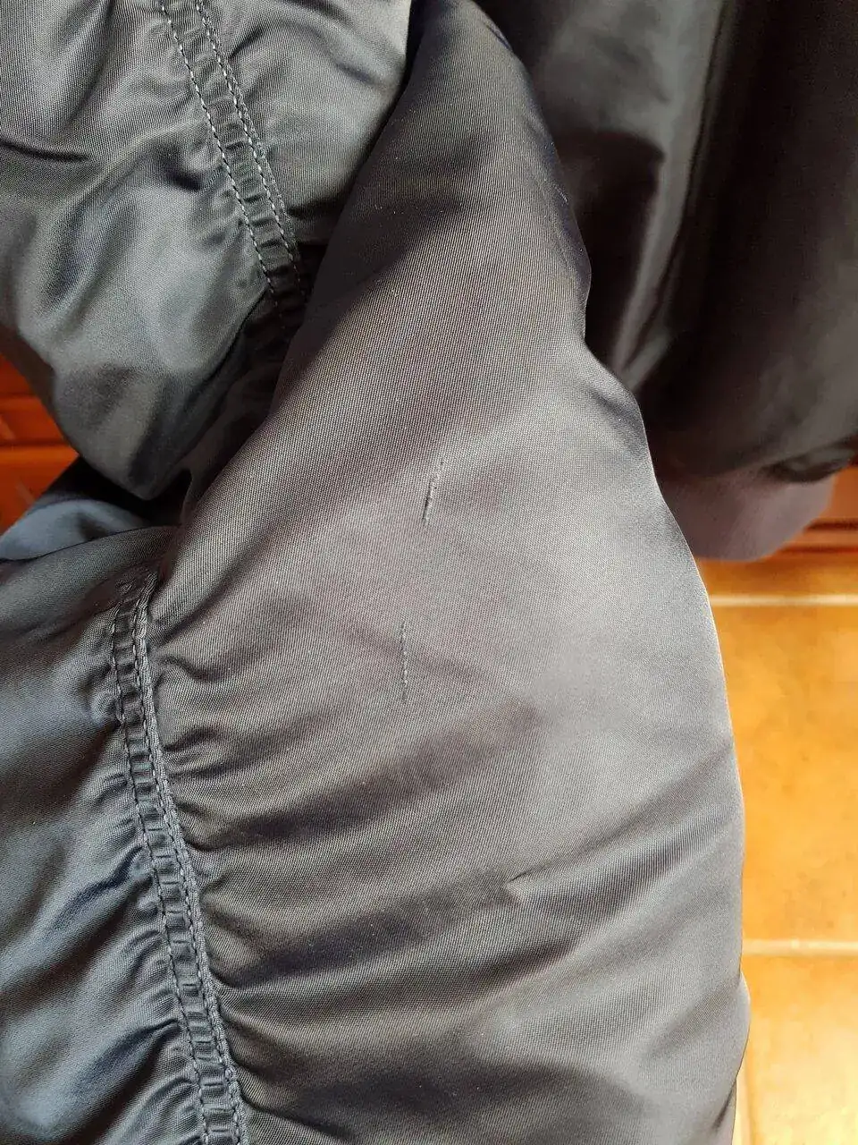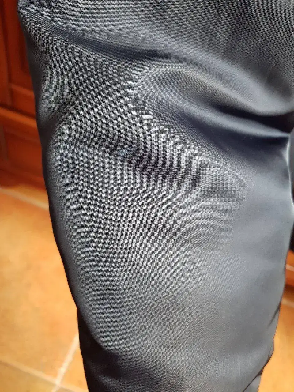 -Pequeño rasguño en codo izquierdo que no afecta a la integridad del tejido y queda oculto bajo los pliegues.