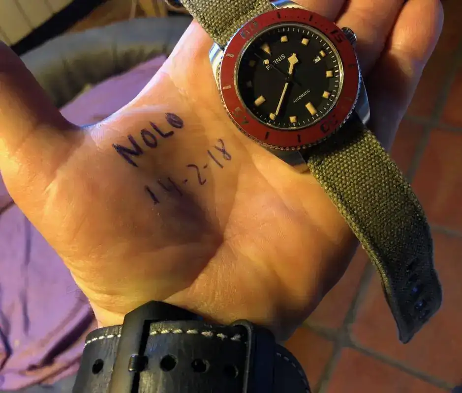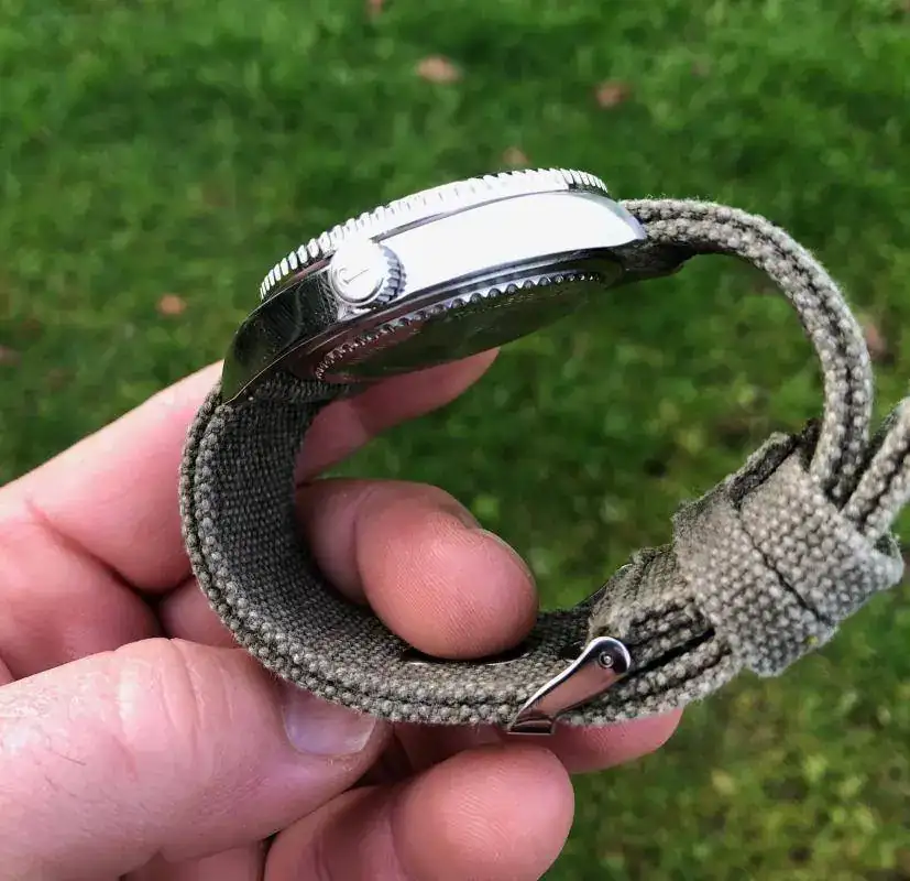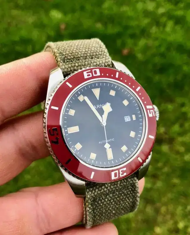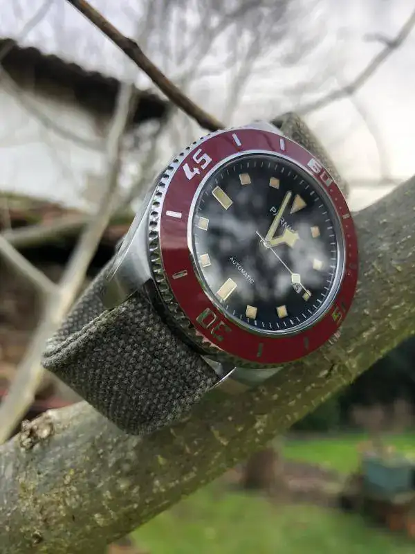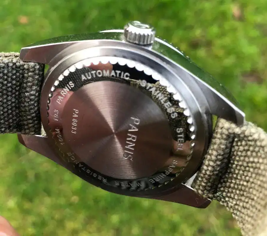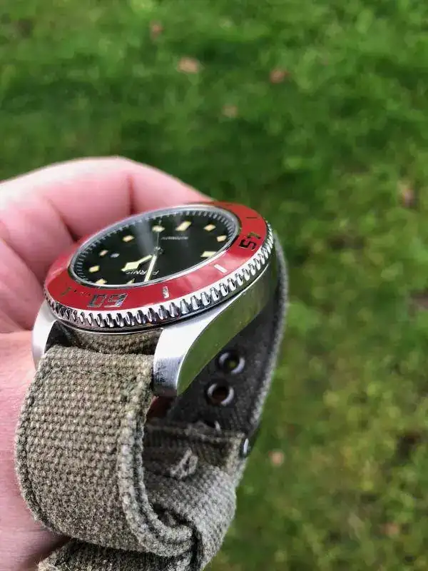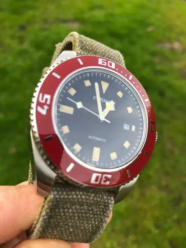 Hola a todos, pues en esta ocasión saco a la venta este bonito Parnis mezcla de influencias con un llamativo bisel rojo. Vino procedente de un cambio con un compañero de este foro pero como apenas lo he usado he decidido que salga y lo disfrute otro. Eso si, como hago con todos mis chinos nada mas recibirlo lo mande a nuestro amigo Angelo donde le aplico ese bonito lumen tostado y le hizo la prueba de estanqueidad, así que, el que se lo lleve tiene Parnis para rato. La correa es tipo canvas en un verde oliva que ademas de ser comodisima creo que le queda bastante bien.Tapa y corona roscadas y bastante mas preciso que mi seiko tuna ( lo cual me fastidia un poco, todo hay que decirlo..