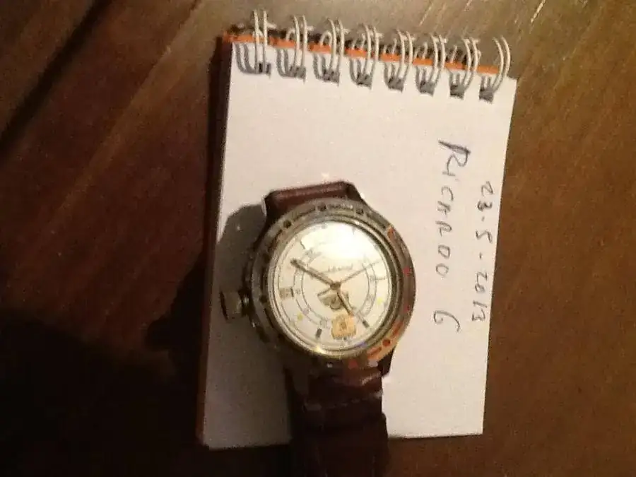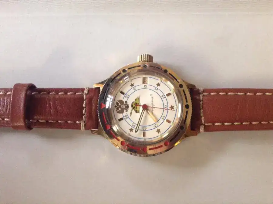 Tipica caja de bostok corona y fondo roscados. No es sumergible de los de 200 mts.. No se debe mojar,como ningun reloj que no lo diga especifico en esfera y fondo.Esfera blanca, no lleva estrella sino el guila bicefala, un tanque, unos caracteres cirilicos y la B de Boctok al las seis. Calendario.