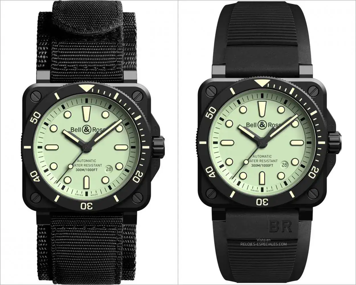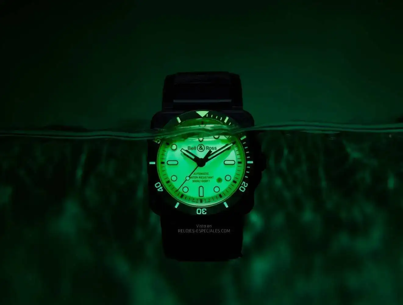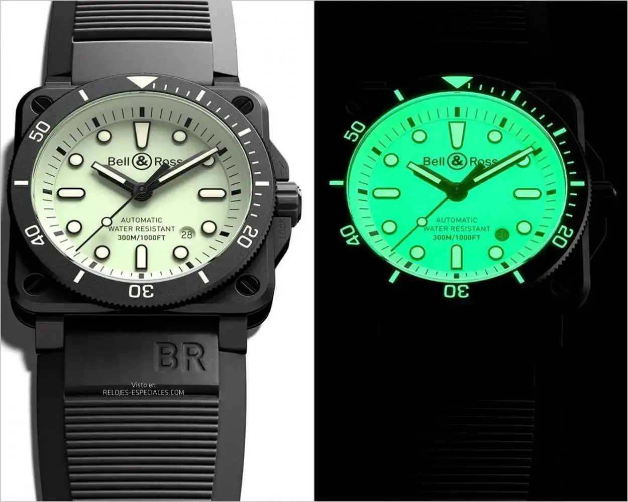 Con respecto a la legibilidad, Bell & Ross adapta el concepto Lum a su colección de buceo e invierte los principios tradicionales de legibilidad diurna y nocturna. Con el BR03-92 DIVER FULL LUM se trabaja con diferentes tonos de luminiscencia: mientras que la esfera de metal está completamente recubierta con Superluminova® C5, los índices esqueletados y los números del bisel están rellenos con Superluminova® C3 verde, lo que proporciona una durabilidad muy larga y, con un contraste verde sobre verde en la esfera, son legibles a 25 cm en la oscuridad (ISO 6425)