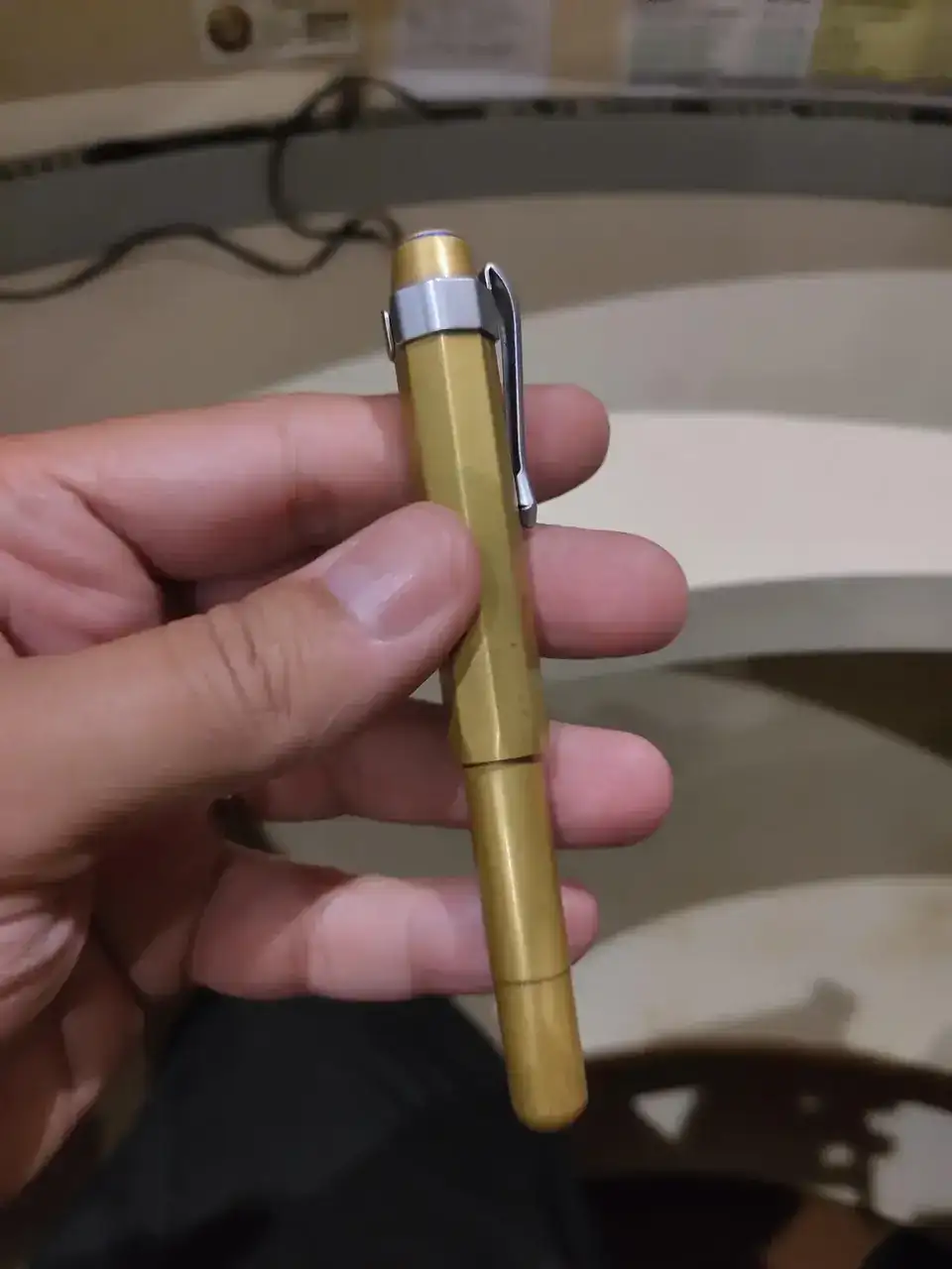 Pues yo tenía una pluma china de unos 4 euros puesta en casa.Me estoy planteando brassear un komandriskie estilo militar, no sabia que fuera tan fácil quitarle la capa de cromo, la patina creo que he conseguido la que quería, la he probado en un bolígrafo de latón con papel de cocina empapado en amoniaco amarillo del mercadona en la base de un taper puse el bolígrafo le puse un poco de sal gorda y lo cubrí con otra capa de papel empapado en amoniaco y a reposar un par de horitas y este es el resultado una especie de patrón de camuflaje, que no se si sere capaz de repetir.