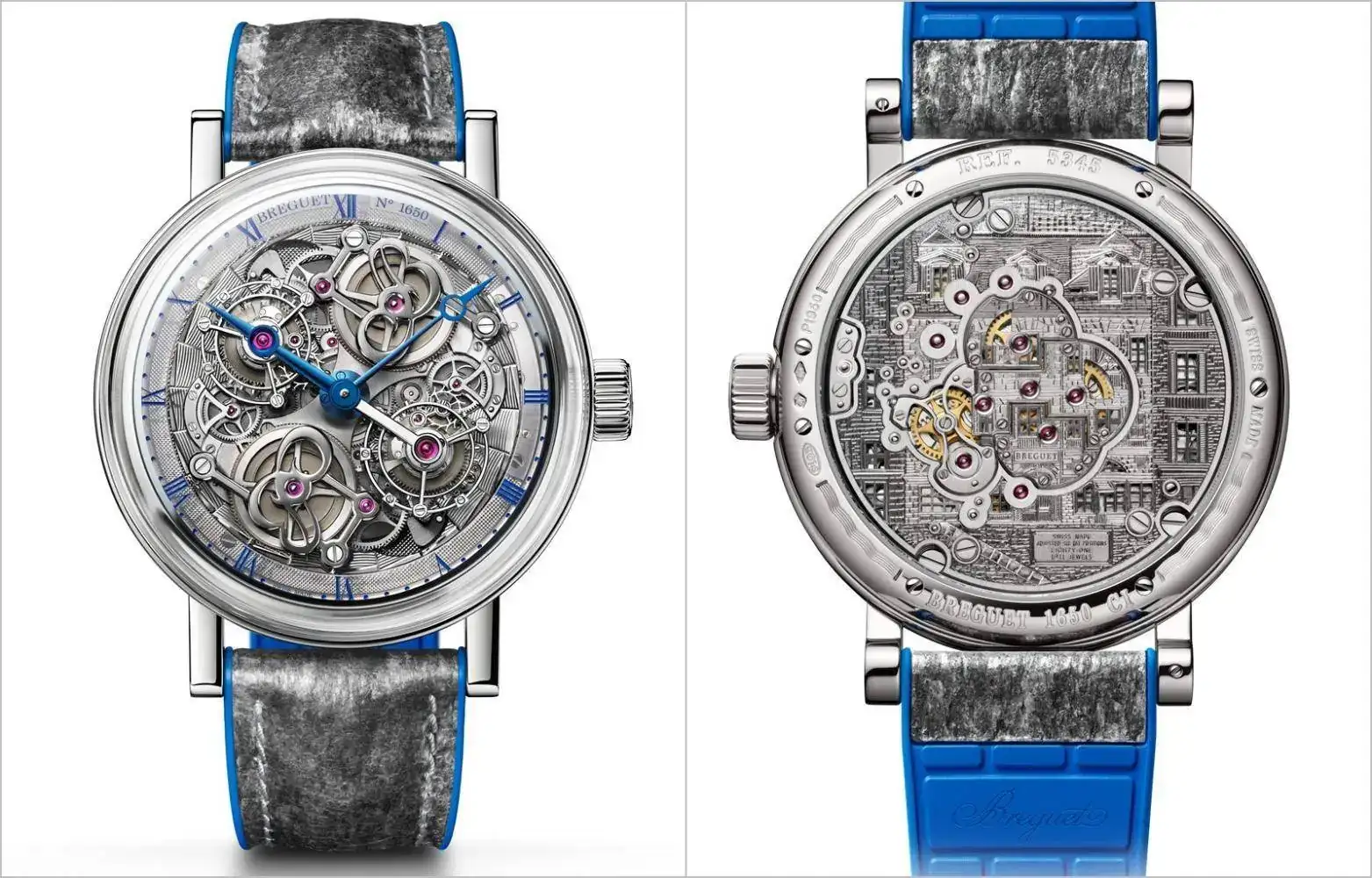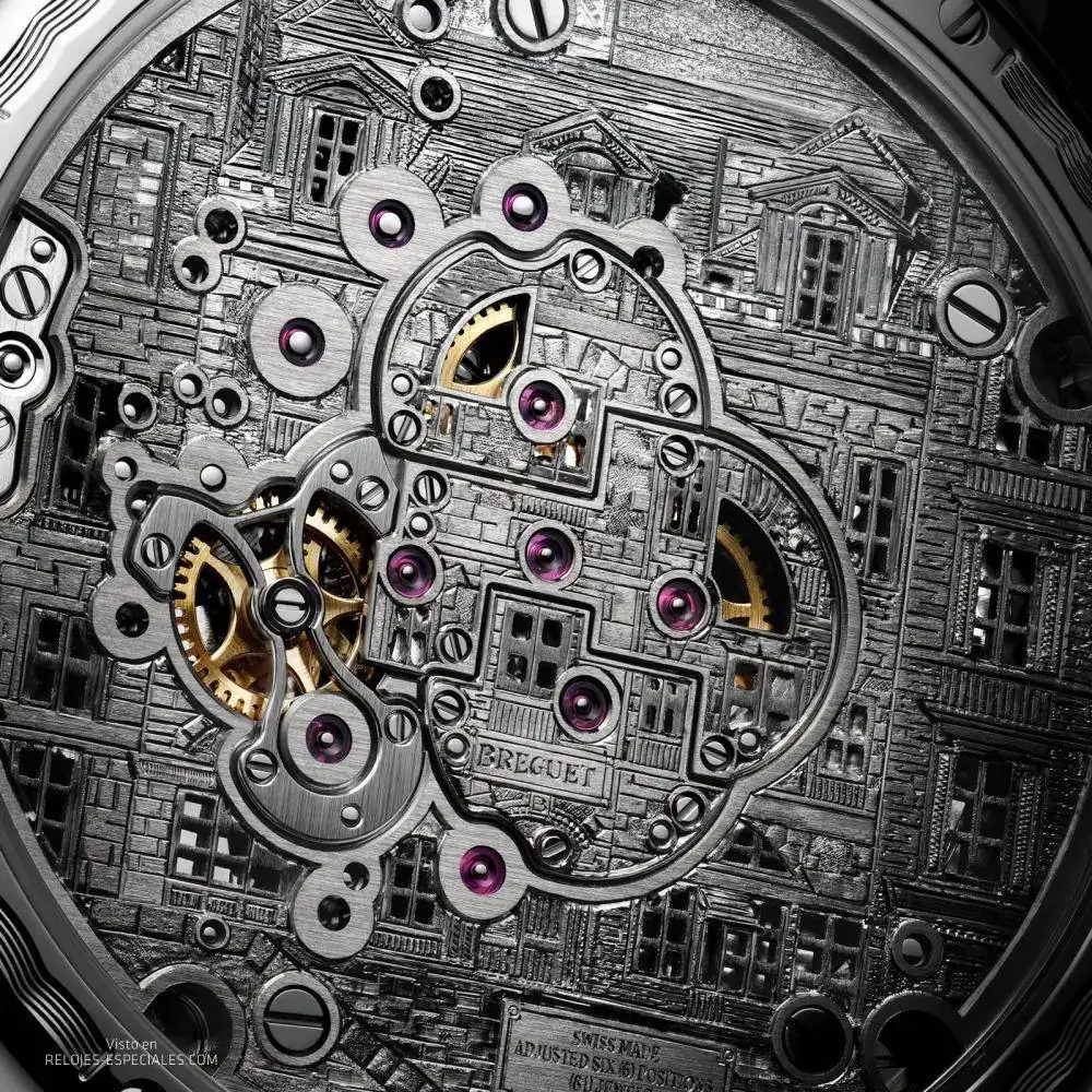 Este nuevo modelo conjuga virtuosismo mecánico y maestría estética: el movimiento, que queda al descubierto, desvela dos tourbillones que accionan el conjunto de la platina gracias a un diferencial central. Todos los componentes están terminados a mano, mientras que el fondo del movimiento luce un grabado -a mano- de la Maison du Quai, el edificio parisino en el que Abraham-Louis Breguet llevó a cabo toda su obra. Fue precisamente aquí donde Breguet ideó, dibujó y construyó el elemento protagonista -por partida doble- del Classique 5345: el “tourbillon”, que Breguet eligió en su acepción ya olvidada de “sistema planetario”.