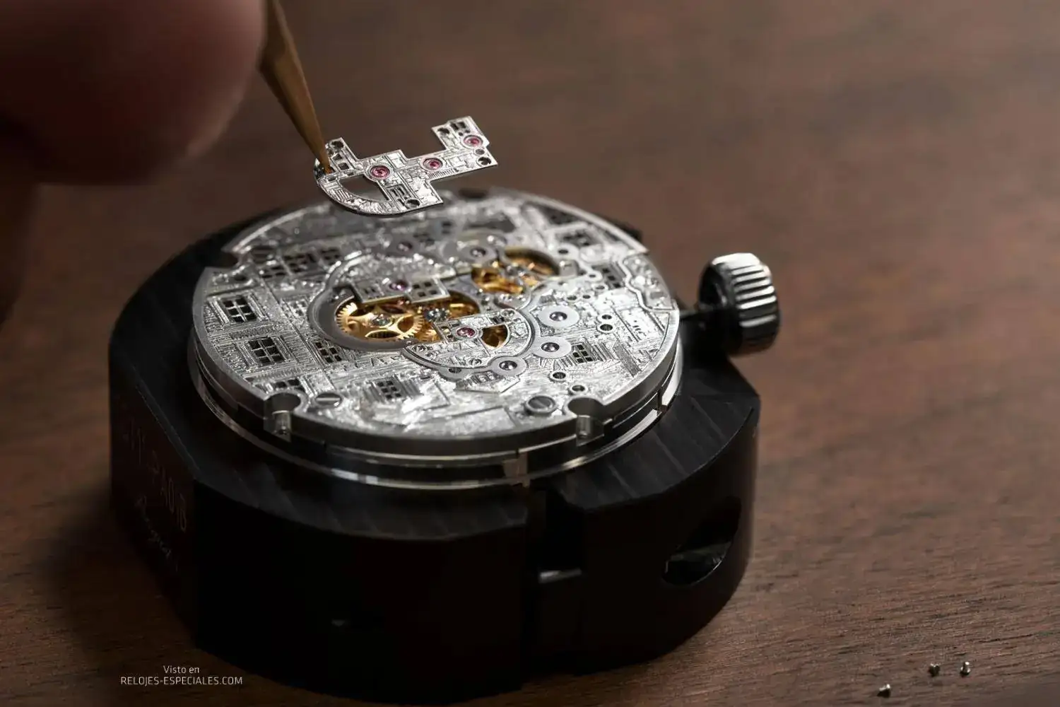 En el reverso del movimiento un grabado realizado a mano representa el edificio del Quai de l’Horloge de París.