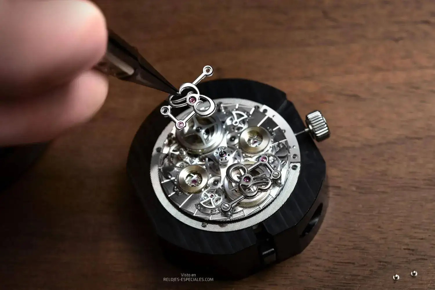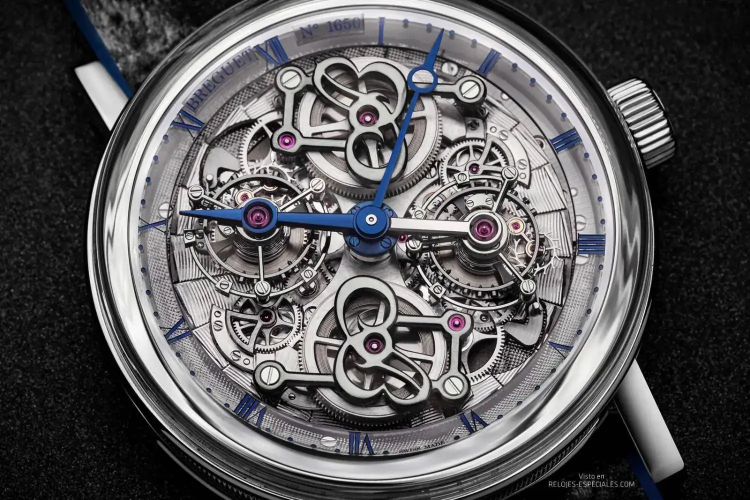 El movimiento pivota sobre sí mismo al ritmo de una vuelta cada 12 horas, impulsado por dos tourbillons independientes que efectúan a su vez una rotación completa cada minuto sobre sí mismos. De esta manera, los órganos reguladores interconectados efectúan un doble giro, impulsando simultáneamente la barra del tourbillon que resulta así ser la aguja de las horas. Al igual que en las Grandes Complicaciones de la época, los componentes son de oro. Pero los espirales son de acero, con la "curva Breguet", inventada por adivina quién, que les permite un despliegue concéntrico. como entonces, los relojeros dan forma a esta curva de forma manual.