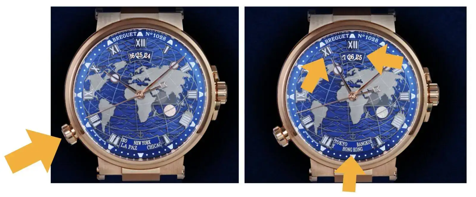 Breguet ha estado trabajando tres años desarrollar este reloj (y es la tercera generación del Marine, si consideras los múltiples modelos Marine agrupados por familias de lanzamiento en la serie 4400, 58xx y 55xx) y ha patentado cuatro innovaciones que permite un doble huso horario con memoria de cambio instantáneo. Esta ventaja técnica es posible gracias a la manipulación del pulsador y de la corona. Tras determinar la primera ciudad, la hora y la fecha, el propietario del reloj solo tiene que ajustar la segunda ciudad. El mecanismo interno calcula entonces automáticamente la hora y la fecha gracias a un audaz sistema de levas, martillos y un diferencial integrado.