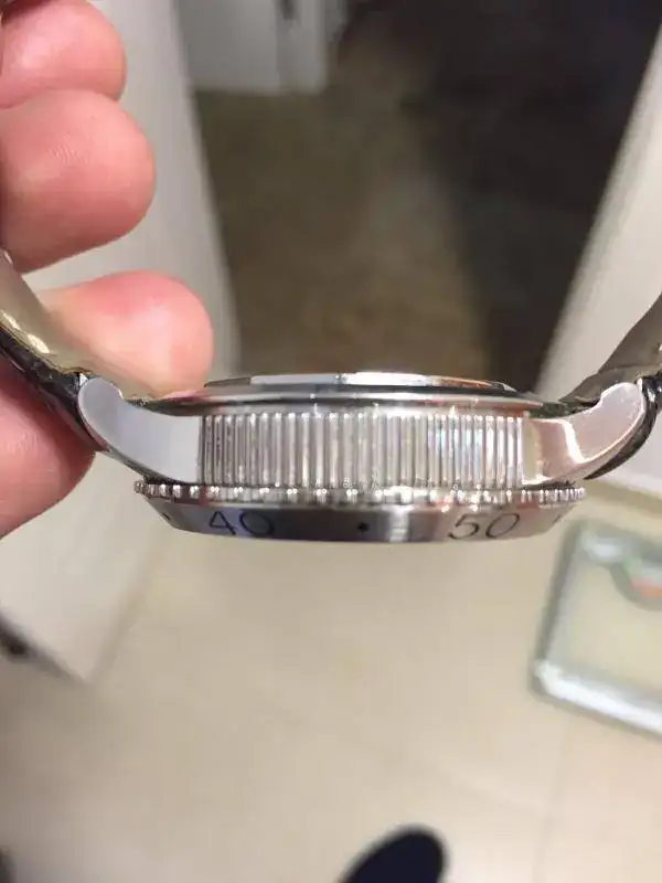 Bisel bidireccional cepillado graduado en 60 clicks. Ligera marca de uso a las 11h que he intentado reflejar en una de las fotos porque la verdad solo se aprecia según el ángulo y luz.