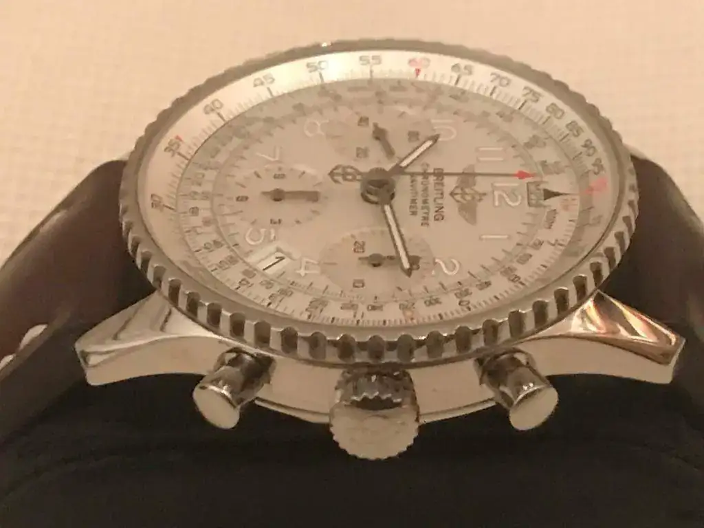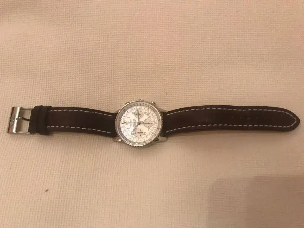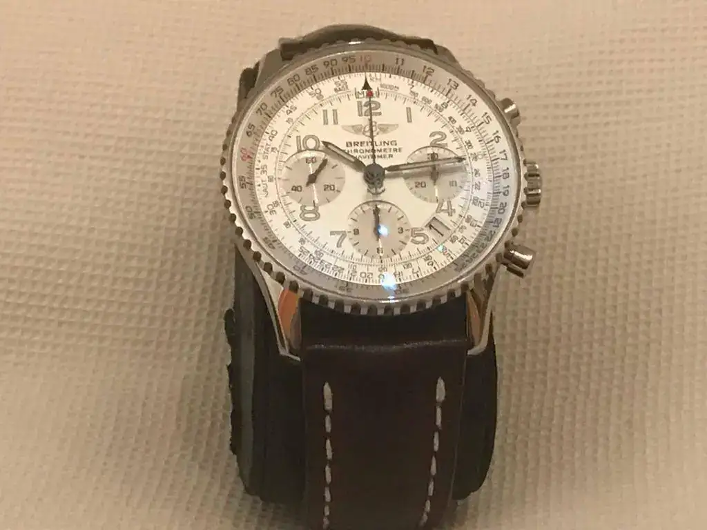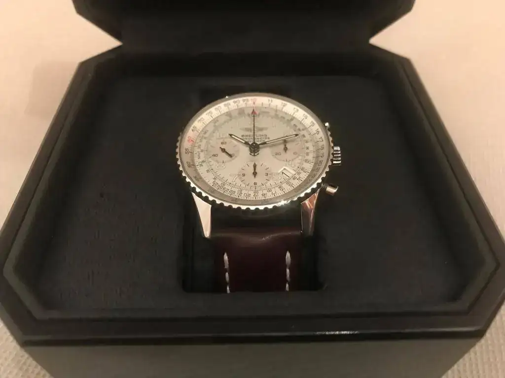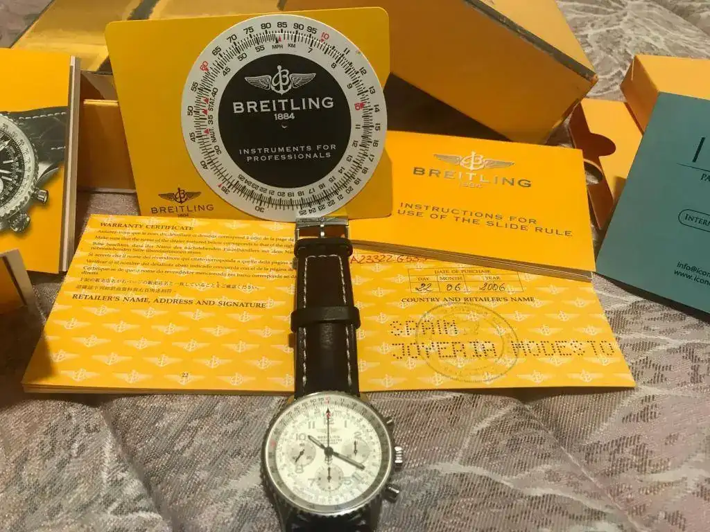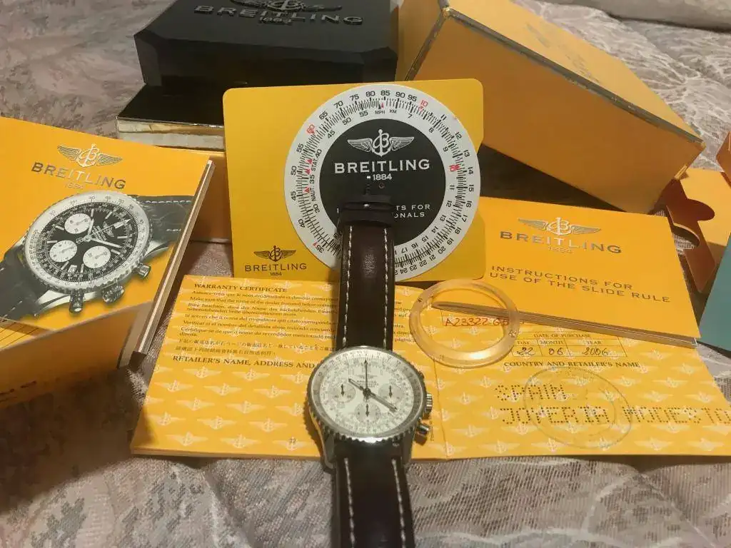 Vendo mi Breiling Navitimer esfera blanca. Comprado a un mercante en el 2015, casi no lo he usado y me he puesto en cancion de otro, por eso el motivo de la venta. Esta en perfecto estado con algun pelillo y con una miniraya que no se ve apenas pero he sacado una foto ampliada para poder verla, que la hice al quitar la correa. Lleva correa de piel original de breiling, al 5% de uso, caja, toda la documentacion, papeles, librillos, garantia ya caducada, atc....