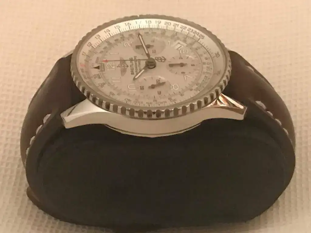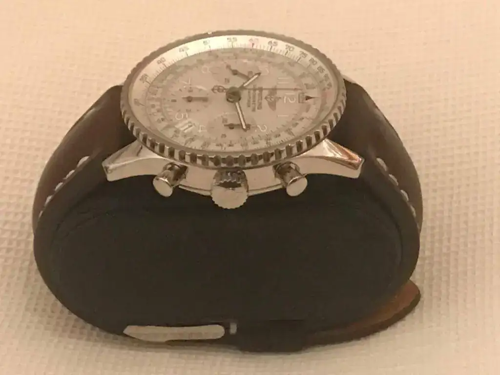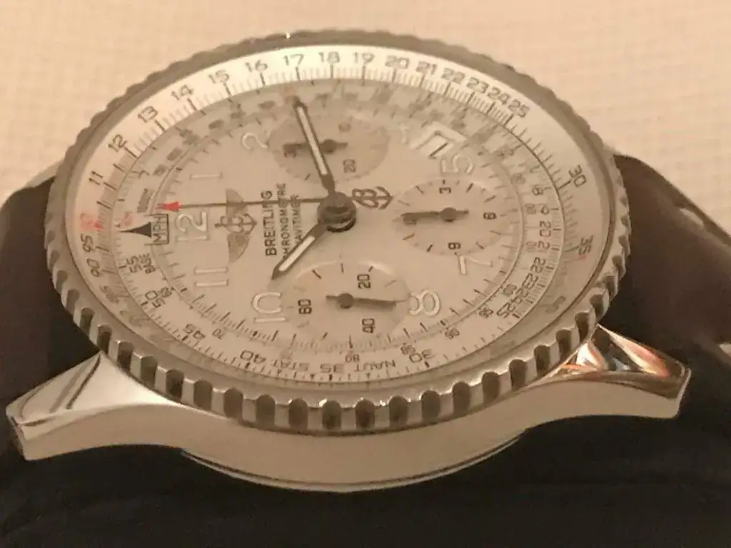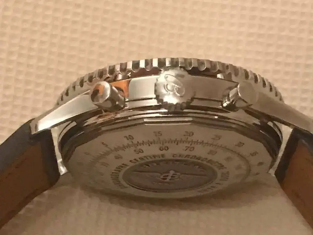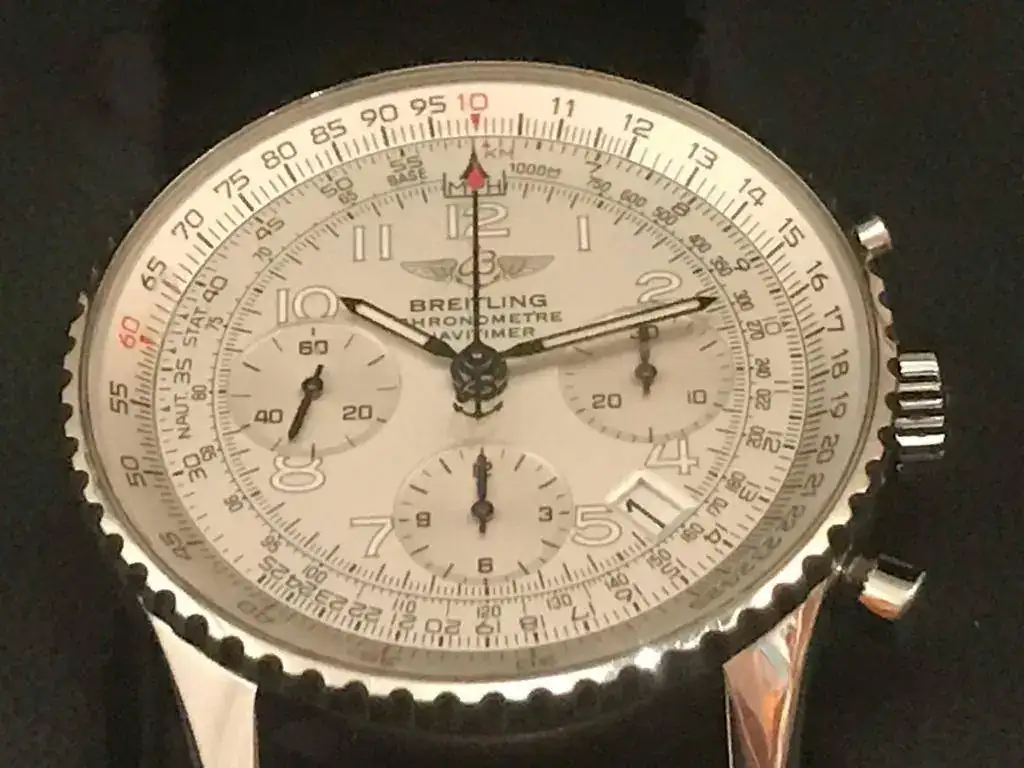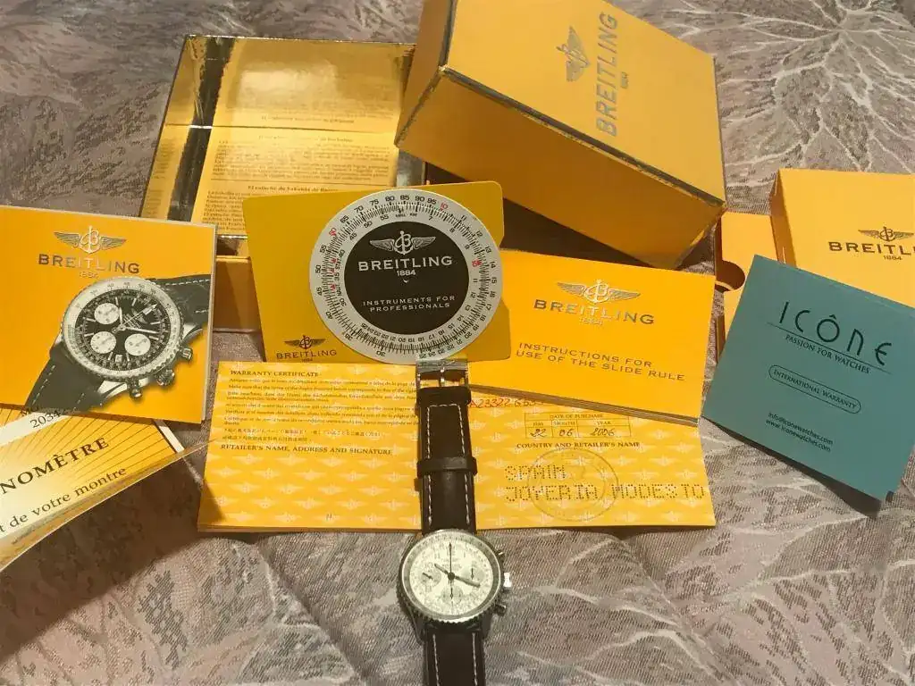 Vendo mi Breiling Navitimer esfera blanca. Comprado a un mercante en el 2015, casi no lo he usado y me he puesto en cancion de otro, por eso el motivo de la venta. Esta en perfecto estado con algun pelillo y con una miniraya que no se ve apenas pero he sacado una foto ampliada para poder verla, que la hice al quitar la correa. Lleva correa de piel original de breiling, al 5% de uso, caja, toda la documentacion, papeles, librillos, garantia ya caducada, atc....
