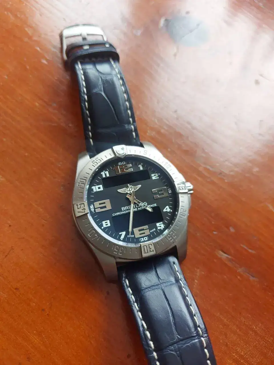 El reloj viene con una correa de caucho Breitling. Además, viene con una croco original Breitlig prácticamente nueva de tamaño pequeño, que aunque sea pequeña según la casa, yo la llevo en el último agujero, con muñeca de 16 cm de contorno. Esta correa cuesta 560€ y con su hebilla original, la cual trae también, supera los 600 €
