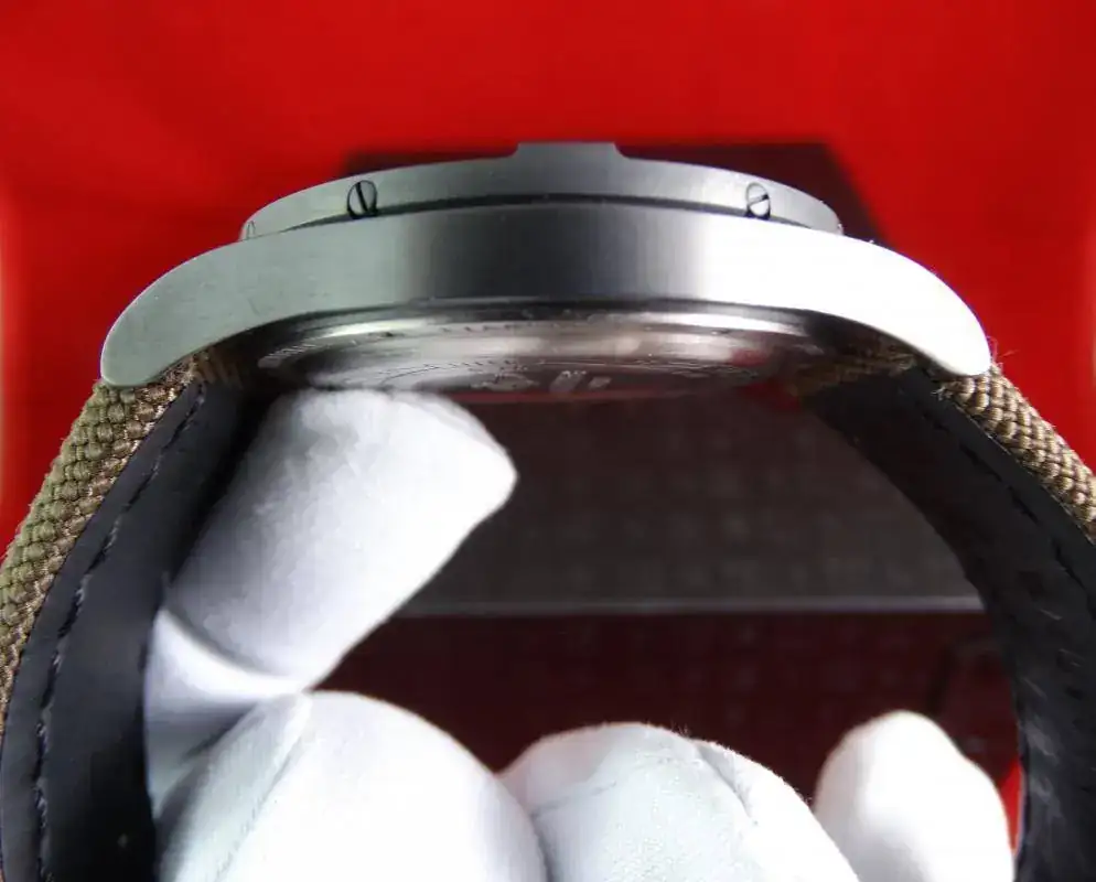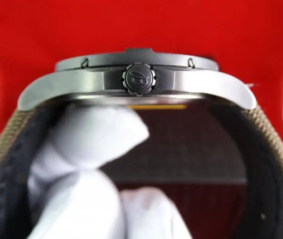 El bisel giratorio grabado se distingue por sus cuatro índices integrados que facilitan el accionamiento, al tiempo que protegen el cristal de zafiro que cuenta con un espectacular antirreflejos por ambas caras. La legibilidad de la esfera se ve reforzada por las cifras y las agujas luminiscentes que destacan sobre el fondo oscuro. La correa Military es de tela marrón high tech de alta resistencia, con cierre desplegable.