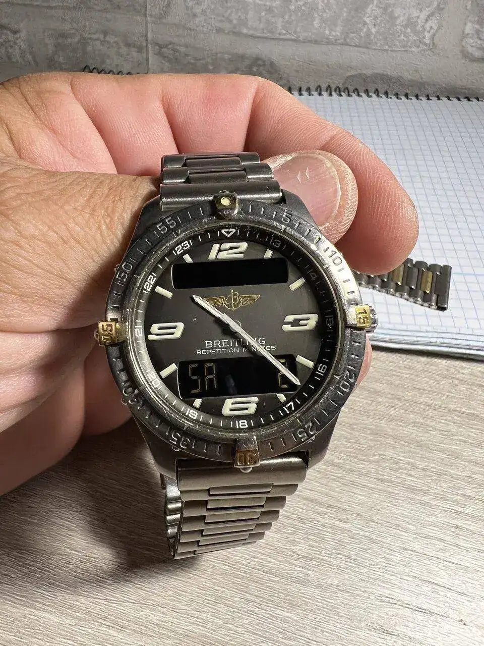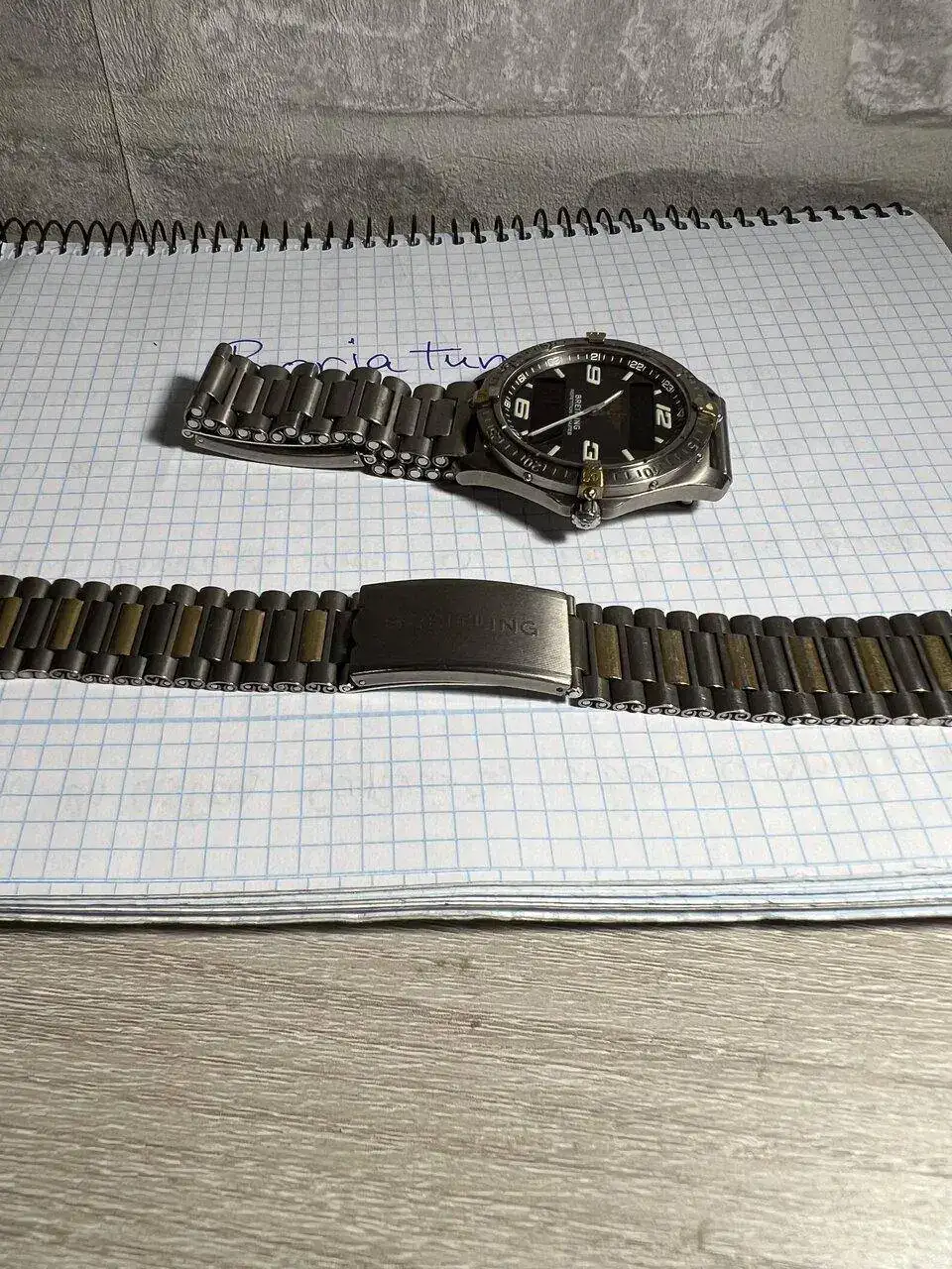 Posee 2 armis originales de titanio, uno de ellos con inserciones doradas, y ambos con el típico cierre extensible que lo hace apto para muñecas de incluso más de 20 cm.