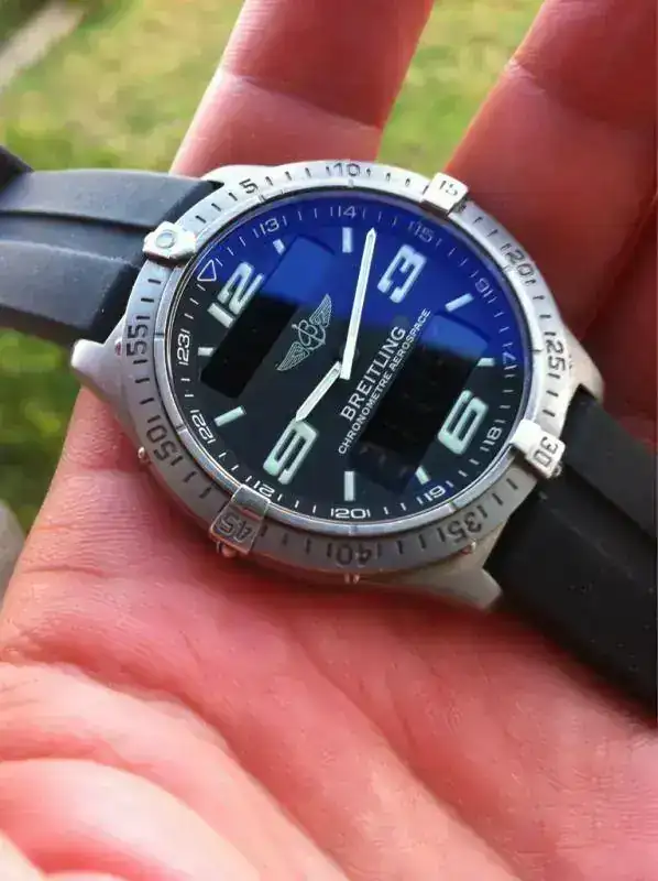 Hola a todos.hoy le toca a este clásico del foro, el ana-digi por excelencia . Caja de 40mm en titanio ,cristal de zafiro y mecanismo superquarzt breitling, crono, doble uso horario,cuenta atrás , repetición de minutos... Una pasada.no tiene caja ni papeles y el antireflejos del cristal esta dañado, algo común en este modelo. Me gustaría un diver crono, tipo Tag aquaracer 300, algún diver dial negro o un crono oro pero en estado excepcional... Gracia por mirar.