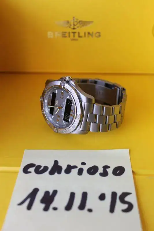 Como elemento a destacar; la flamante esfera de color gris que sustituyó a la que el reloj traía de fábrica (azul vulcano). La sustitución de la esfera y de la batería han sido realizadas el pasado mes de marzo de 2015 en el servicio técnico oficial Breitling España. Sólo la esfera tiene un valor de 400€ y la batería "fresca" tiene garantizado su funcionamiento para los próximos 3/4 años, dependiendo del uso.