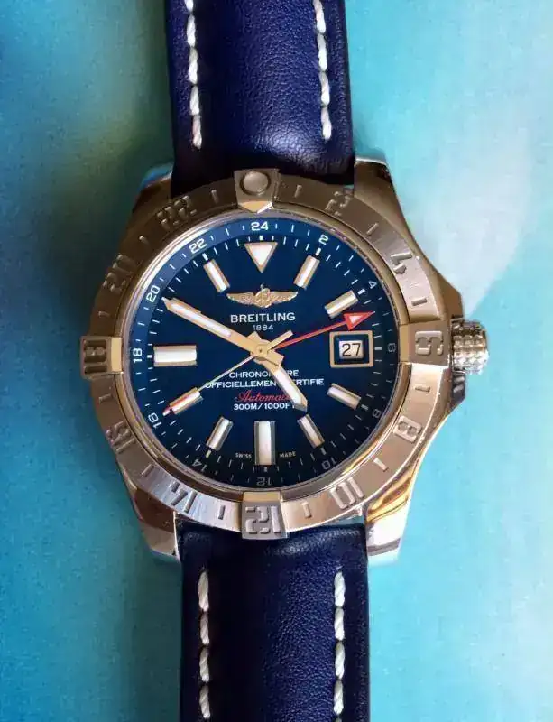 Referencia A32390.Es de 43 de diametro y 12 de grosor,esfera azul y armis cepillado,no brillo.