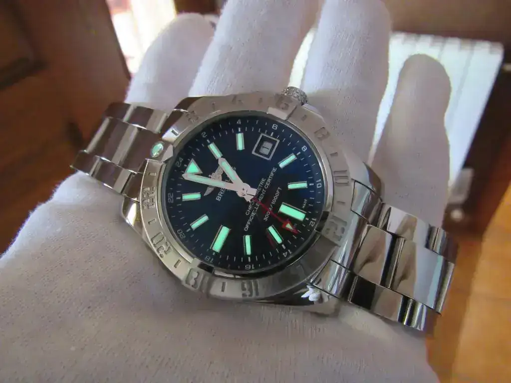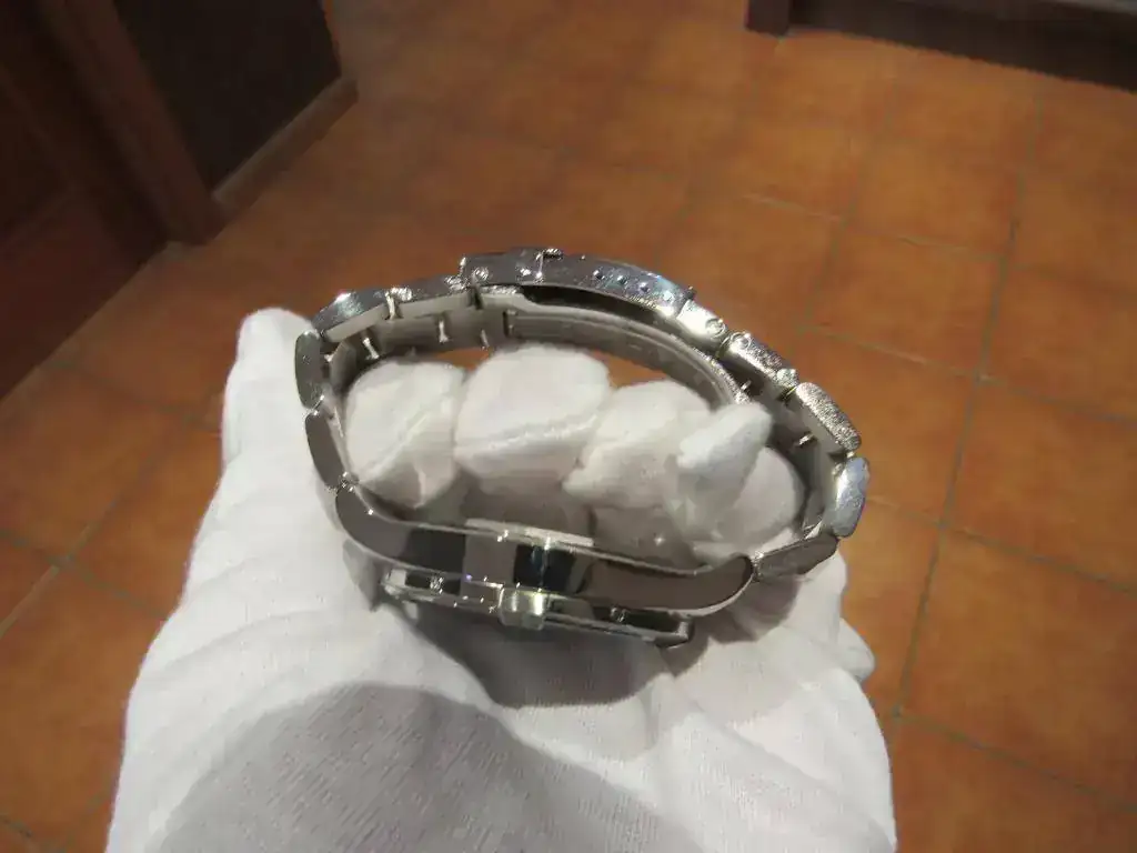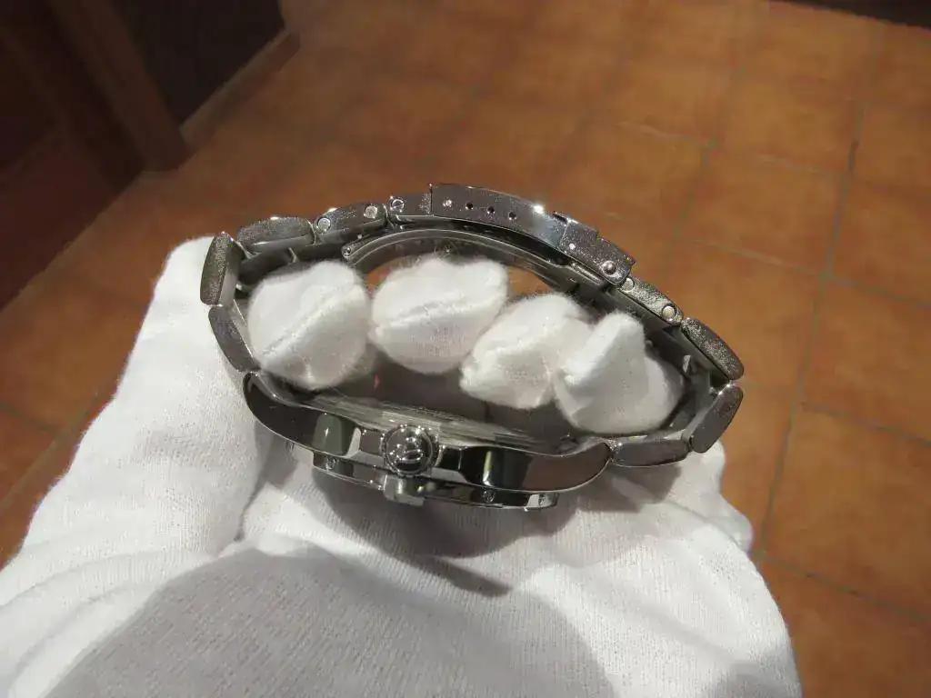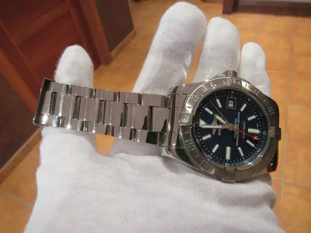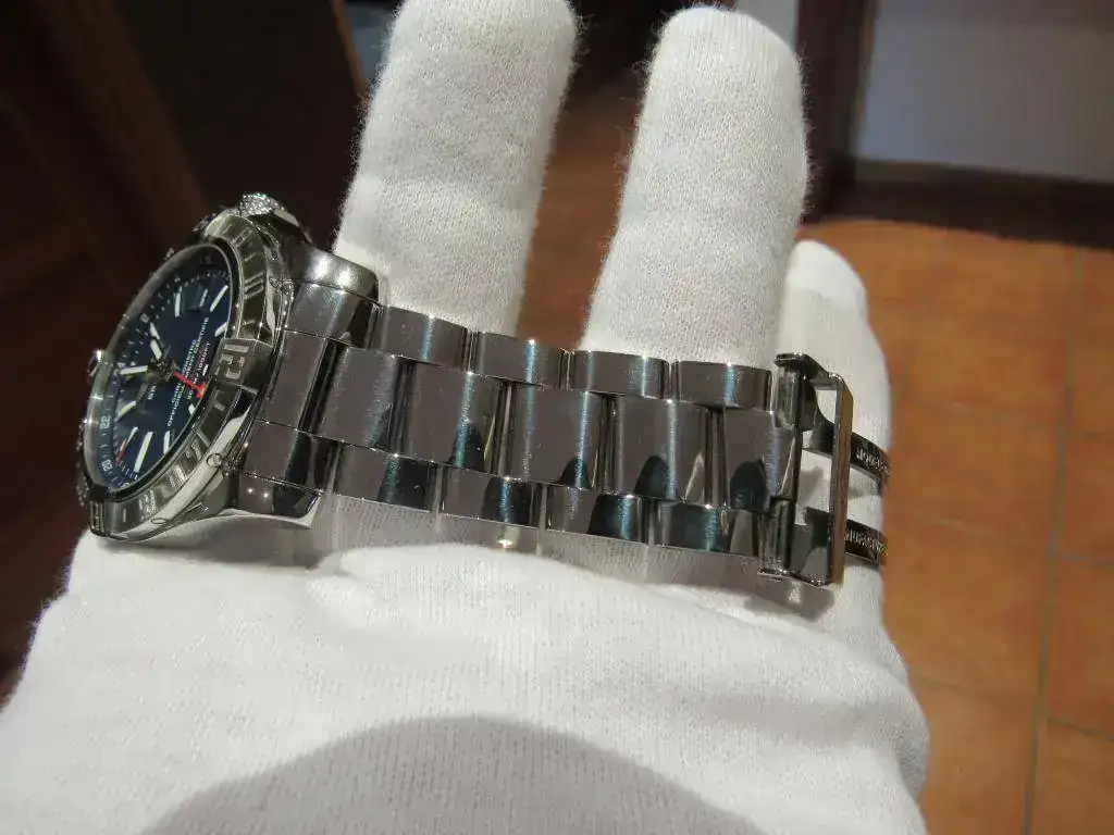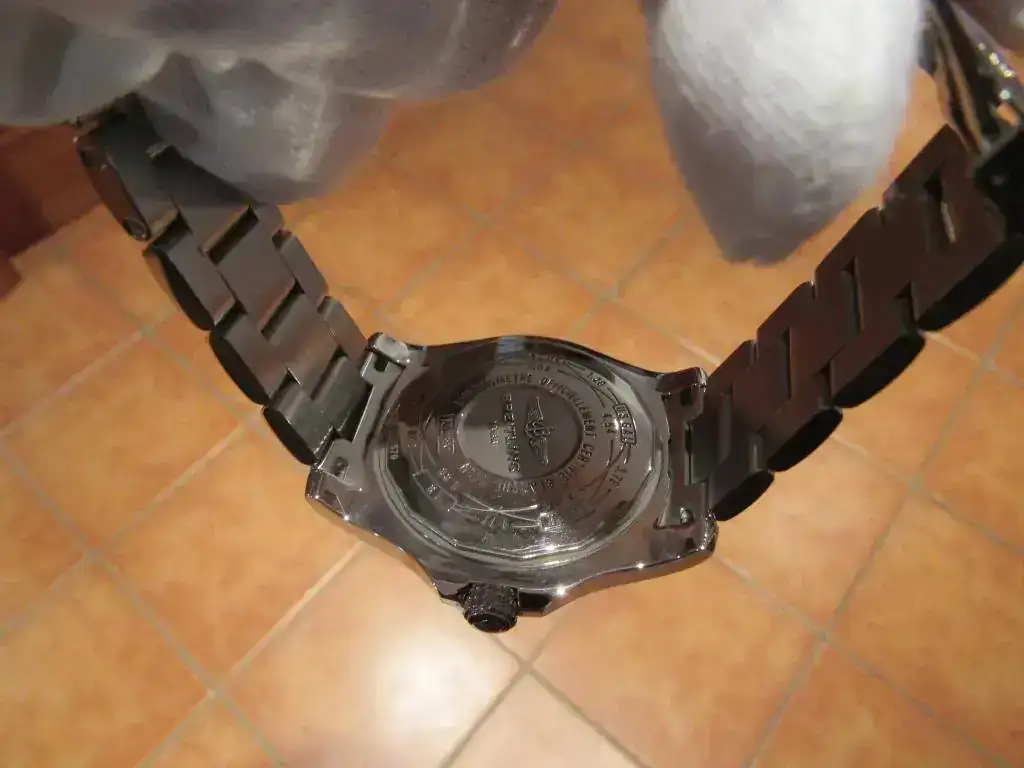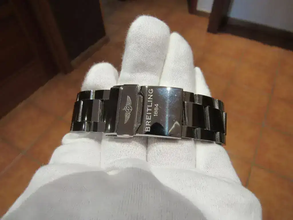 A destacar que recientemente Breitling ha aumentado el tamaño de este modelo, pasando de 43 a 45 mm. por lo que considero que éste tiene un tamaño más racional que el actual. Además, pese a sus 43 mm. el reloj no resulta aparatoso porque es bastante plano, no teniendo nada que ver otros modeos de la marca mucho más altos de caja.