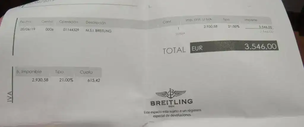 El pvp de dicho reloj ronda los 4.000 euros. Adjunto factura de compra por importe de 3.546 euros, después de aplicar un 10% de descuento sobre el precio de tarifa. En este caso, lo saco a la venta por 2.250 euros, por lo que el descuento es considerable para un reloj con menos de cinco meses y en buenísimo estado.