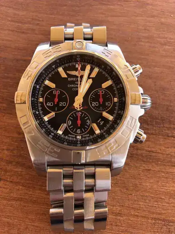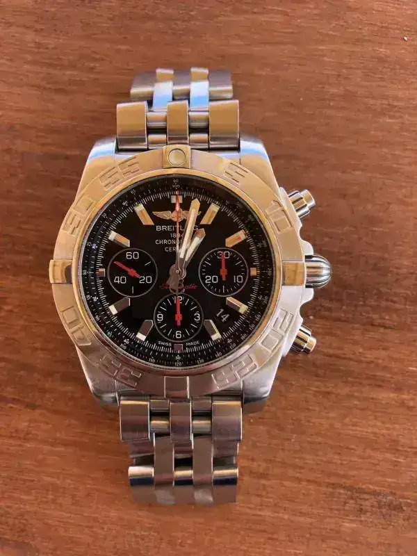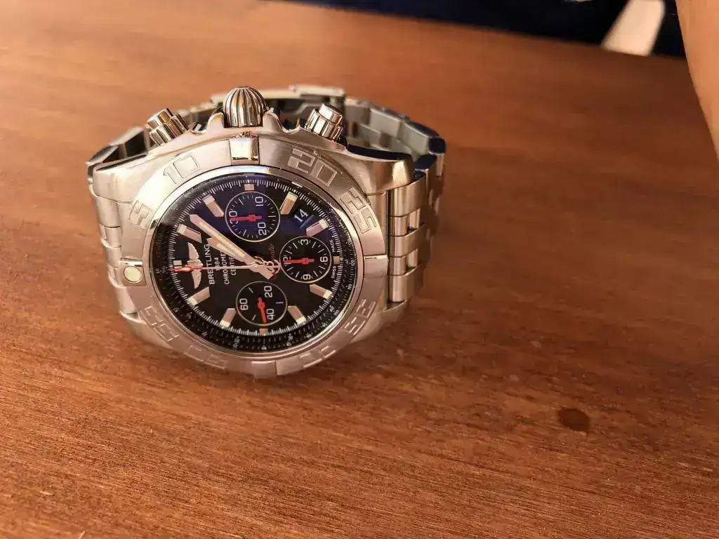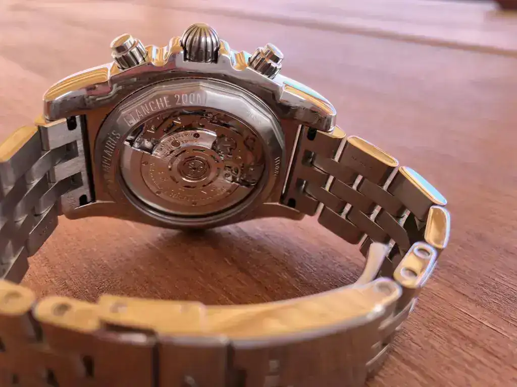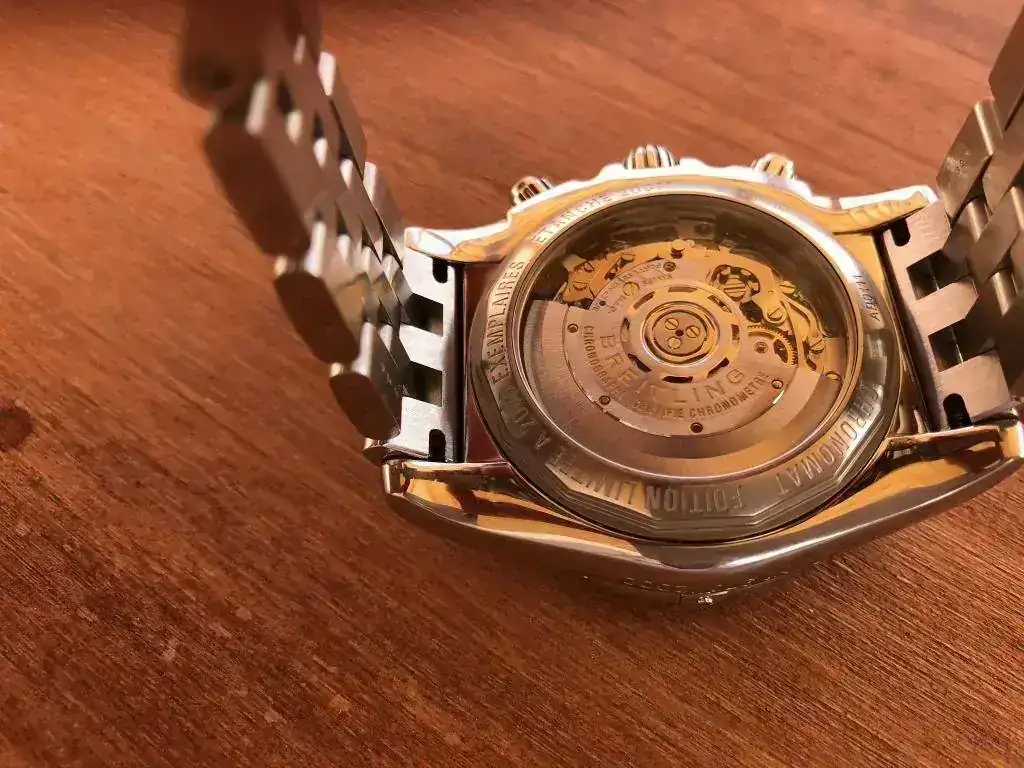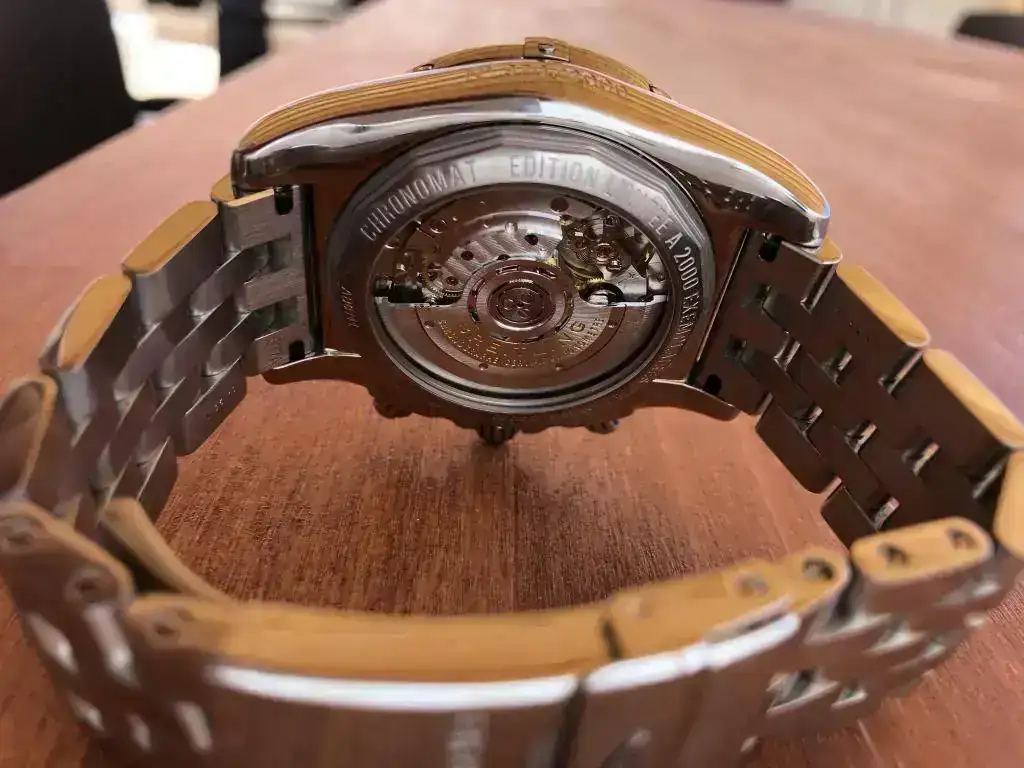 Se trata de una edición limitada a 2000 ejemplares del modelo Chronomat B01. Como particularidades cabe destacar la esfera y subesferas completamente negras con las agujas de las subesferas en color rojo, una preciosidad. Otra de las rarezas de esta pieza es que cuenta con fondo visto para poder apreciar el maravilloso calibre B01 manufactura que late en su interior. Creo que es el único modelo con fondo visto que salió a la venta, hay otro modelo con esta característica pero no salió a la venta al público. A diferencia de sus hermanos de catálogo, tanto la caja como el brazalete pilot tienen un acabado cepillado en lugar de pulido,mucho más discreto y con aspecto de reloj herramienta.