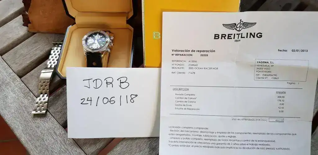 Dicumentacion: No, pero se aporta factura revisión Oficial Breitling ( autentifica piezas y caja que fue cambiada por SAT Breitling)