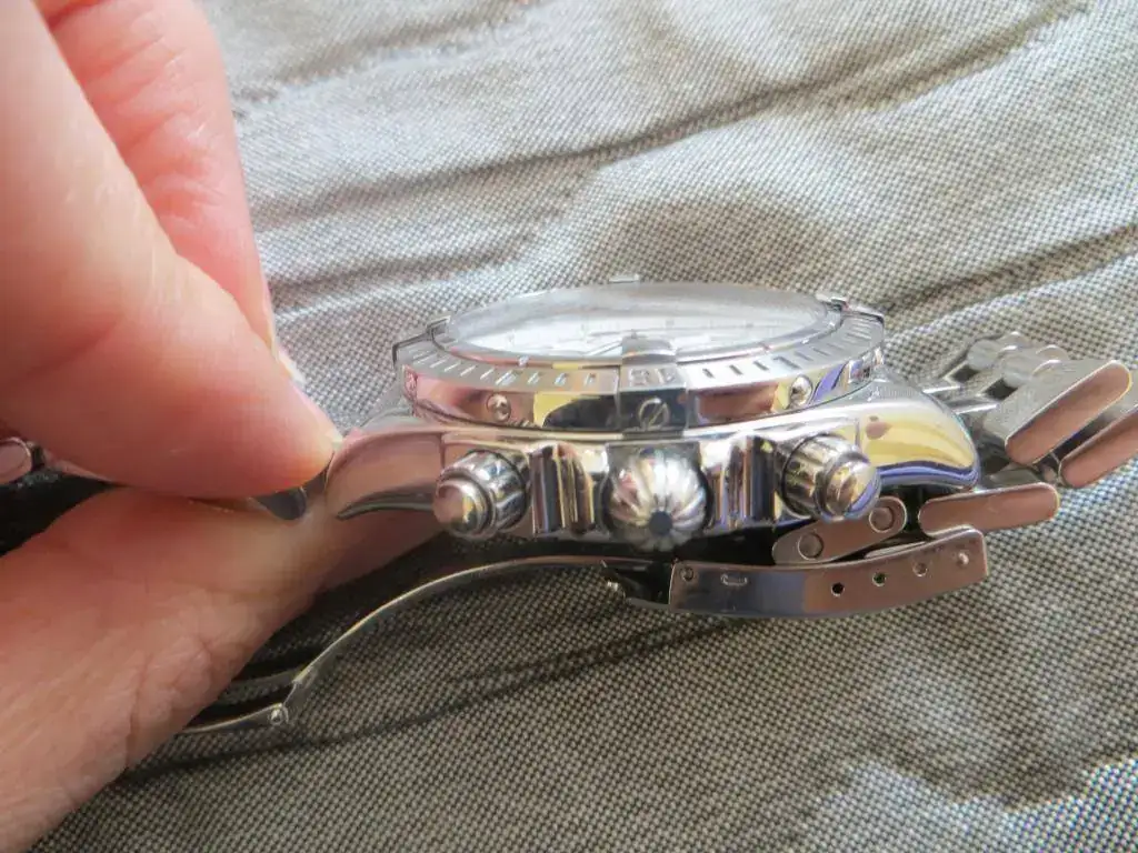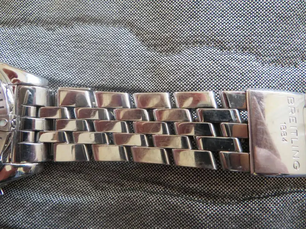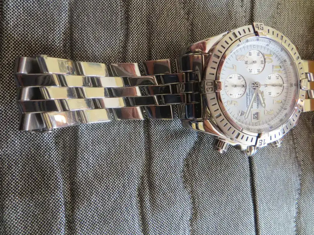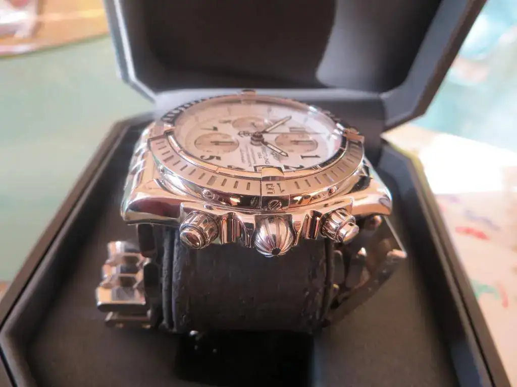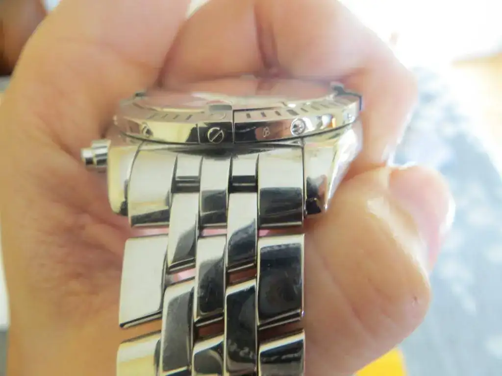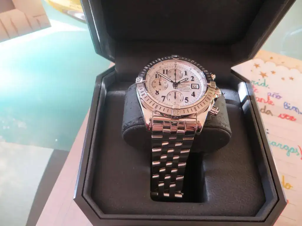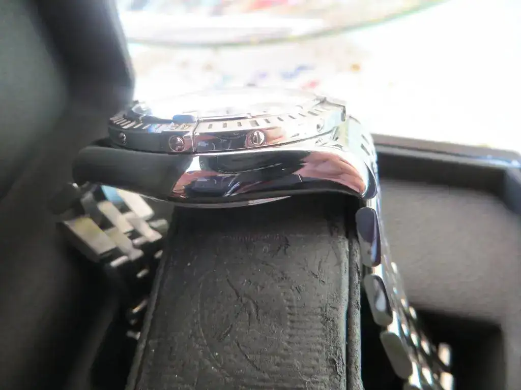 Dado que llevo muchos años sin apenas ponérmelo y la previsión es que apenas encuentre tiempo para hacerlo en los próximos, vendo este Chronomat Evolution del que he sido único propietario para que alguien lo disfrute como merece. Su estado es bueno aunque usado y con un pulido o incluso cape cod quedaría prácticamente nuevo. Tiene los consabidos pelillos en su superficie pulida a espejo, en especial cierre, sólo visibles desde cerca. También tiene una pequeñísima muesca en el lateral de la caja a las siete, que muestro con claridad en una foto, la segunda, (en vivo apenas se ve pero bueno es que quede claro en el anuncio). El antirreflejo del cristal está a mis ojos impoluto permitiendo la absoluta transparencia que caracteriza a los cristales de Breilting