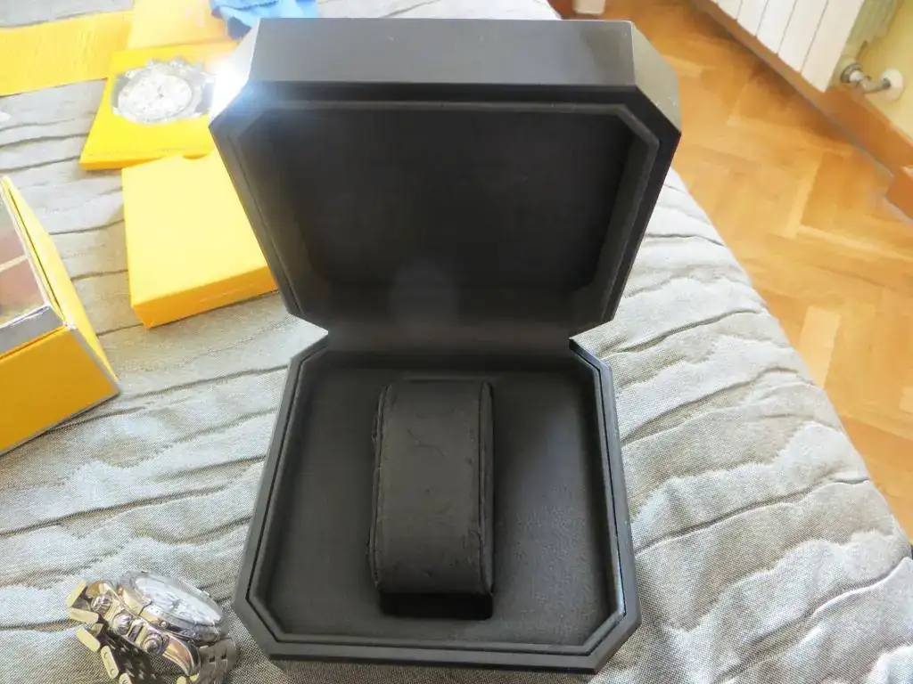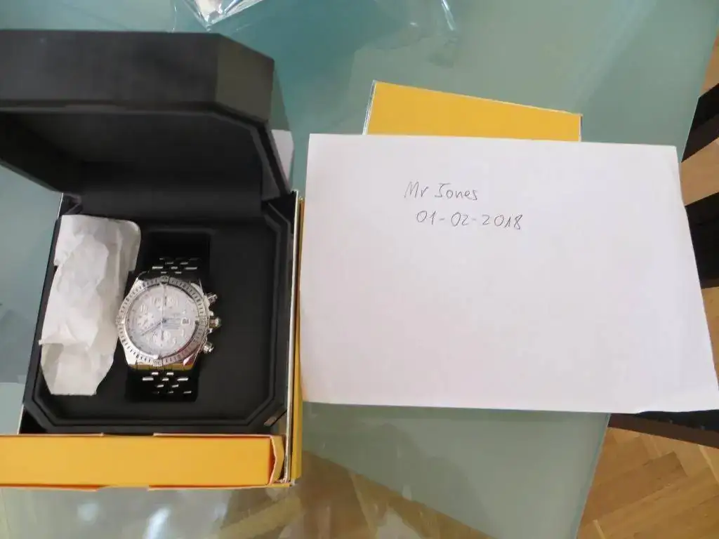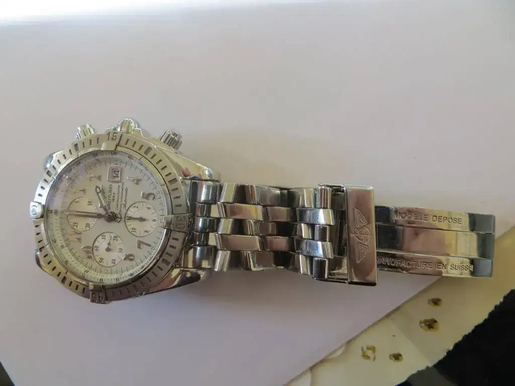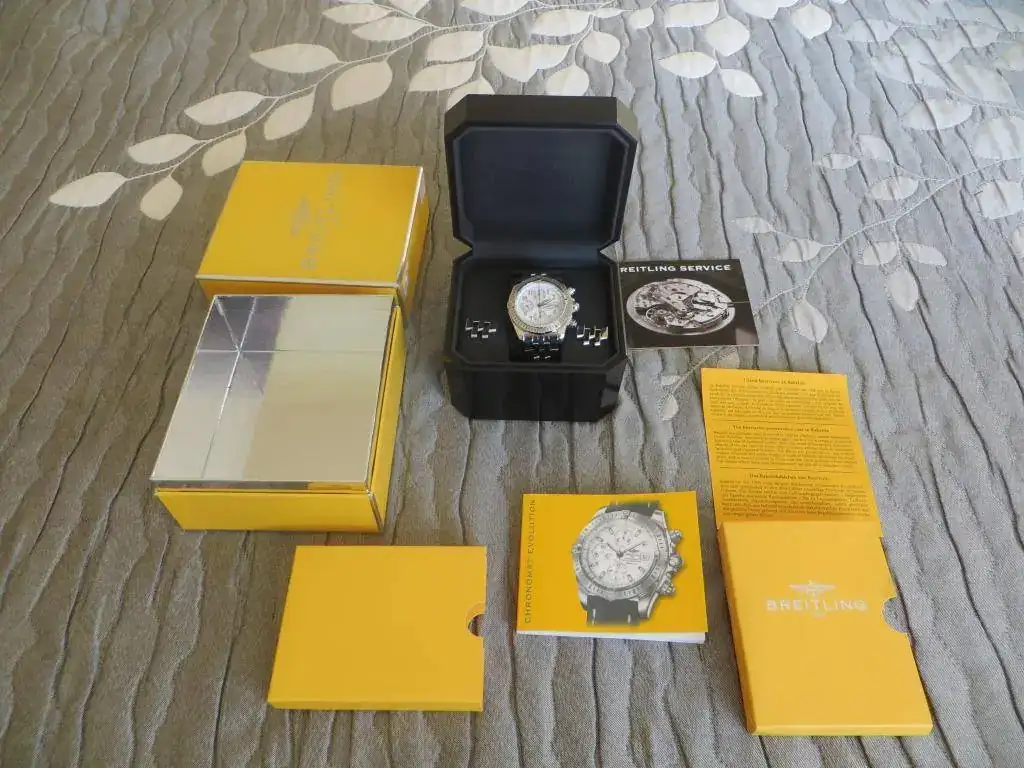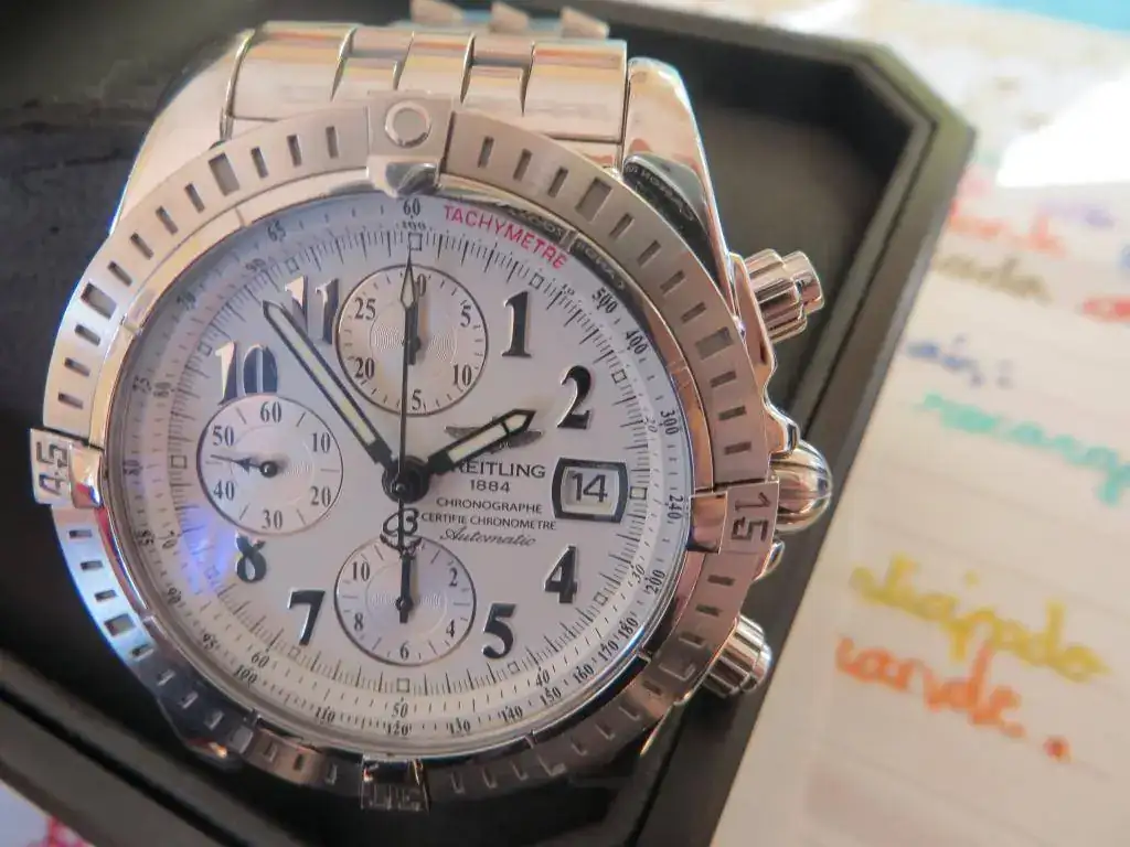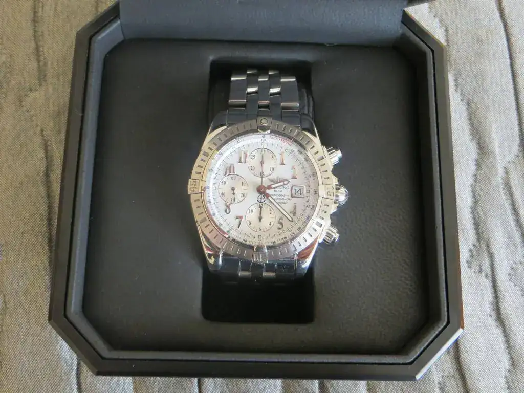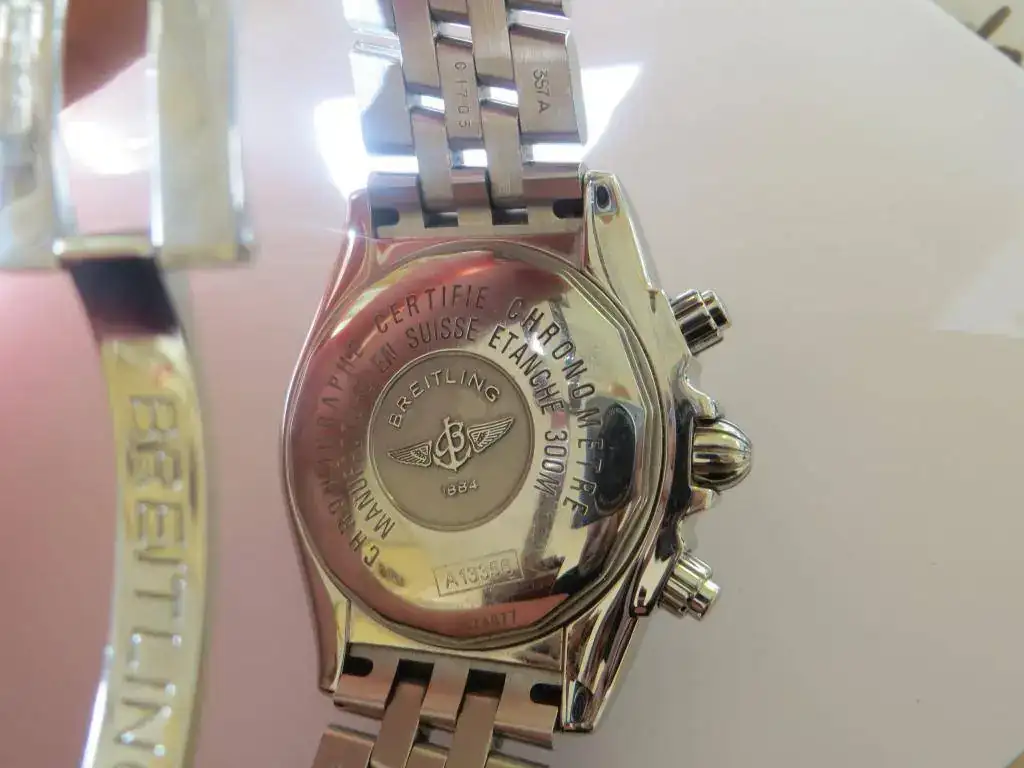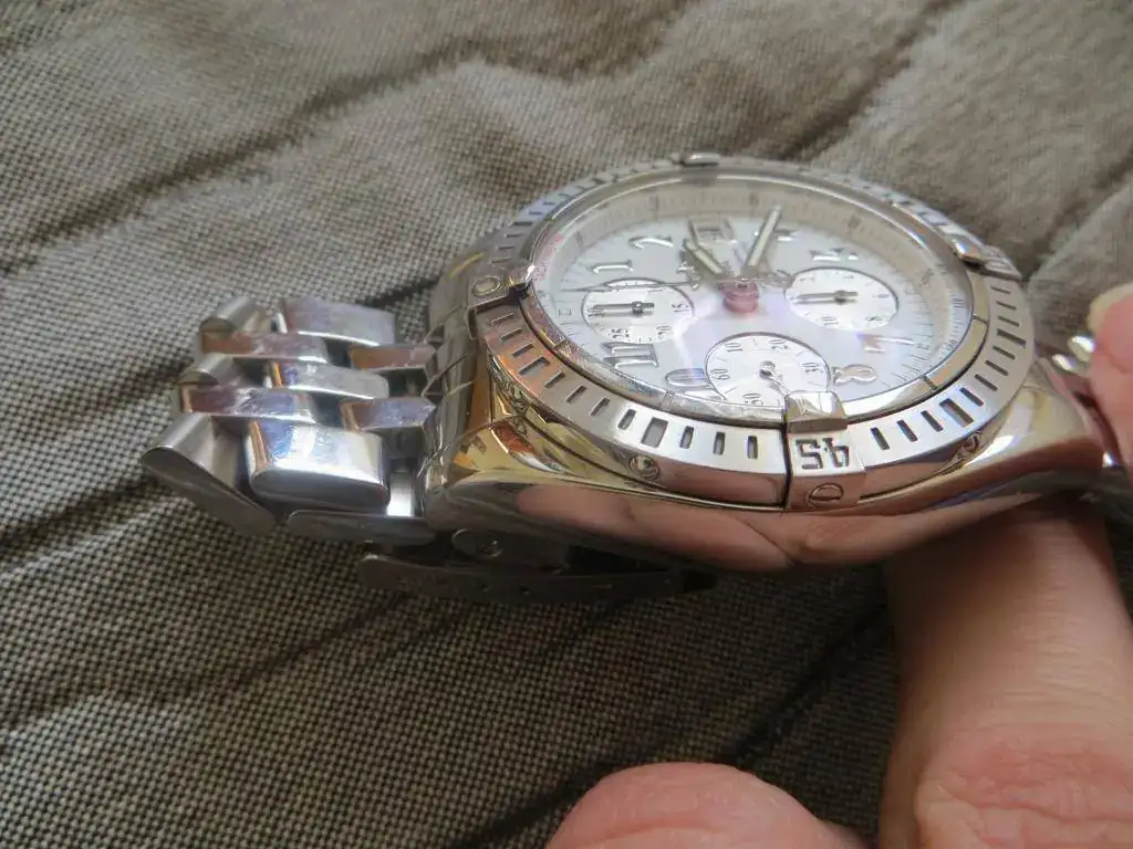 Dado que llevo muchos años sin apenas ponérmelo y la previsión es que apenas encuentre tiempo para hacerlo en los próximos, vendo este Chronomat Evolution del que he sido único propietario para que alguien lo disfrute como merece. Su estado es bueno aunque usado y con un pulido o incluso cape cod quedaría prácticamente nuevo. Tiene los consabidos pelillos en su superficie pulida a espejo, en especial cierre, sólo visibles desde cerca. También tiene una pequeñísima muesca en el lateral de la caja a las siete, que muestro con claridad en una foto, la segunda, (en vivo apenas se ve pero bueno es que quede claro en el anuncio). El antirreflejo del cristal está a mis ojos impoluto permitiendo la absoluta transparencia que caracteriza a los cristales de Breilting