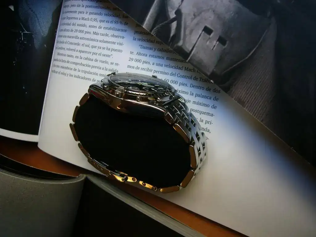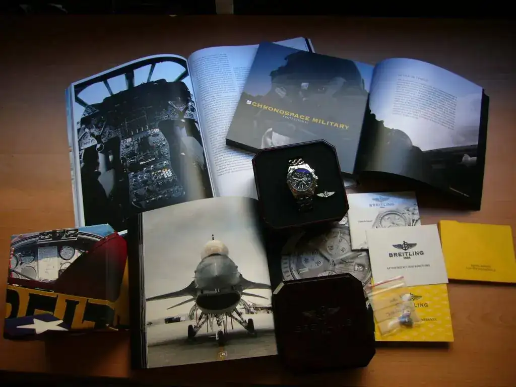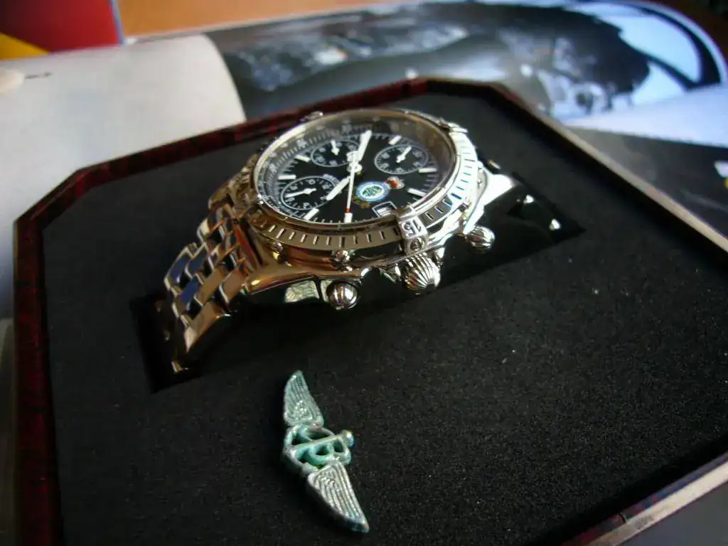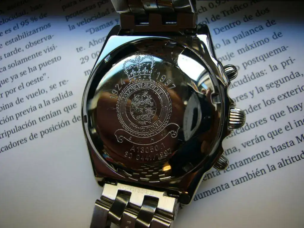 Esta serie limitada de BREITLING conmemora la creación en 1924 del comando aereo de combate de la ROYAL AIR FORCE BRITANICA, para la defensa de HONG KONG y sudeste Asiatico. En la trasera se ve bien definido, el numero de pieza, el año de la efemeride 1997, que coincide con el numero de piezas fabricadas por Breitling para todo el mundo. Esta es la serie limitada numero 0441. El reloj ha sido comprado en el año 2003, esta recien revisado por un relojero de mi confianza y dilatada experiencia, el estado del reloj es casi como nuevo ya que lo he puesto en muy contadas ocasiones. El reloj esta completo, con cajas y documentación original, asi mismo va con su armis pilot y eslabones sobrantes, es una verdadera joya y pieza de coleccionista . para el que no me conozca, mi tarjeta de presentación son mis BONUS, podeis verlos en el apartado correspondiente, son mi mejor tarjeta de presentación. saludos a todos.