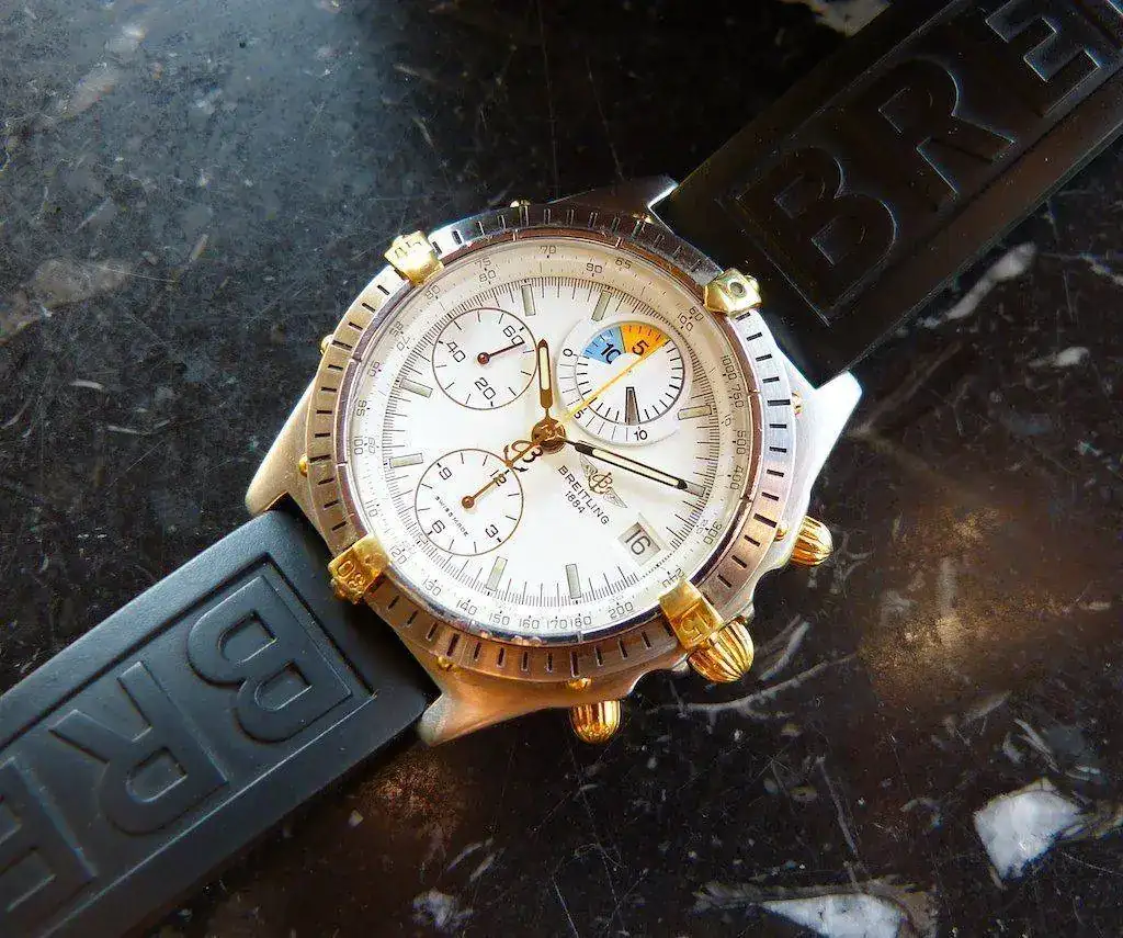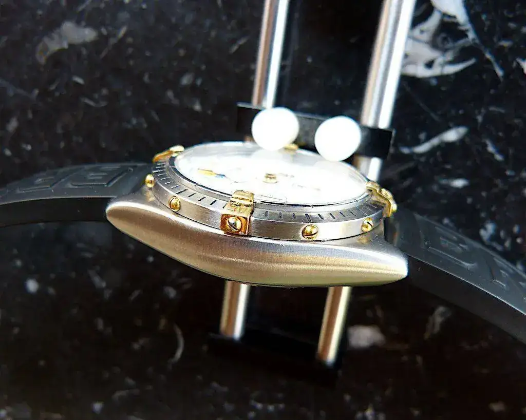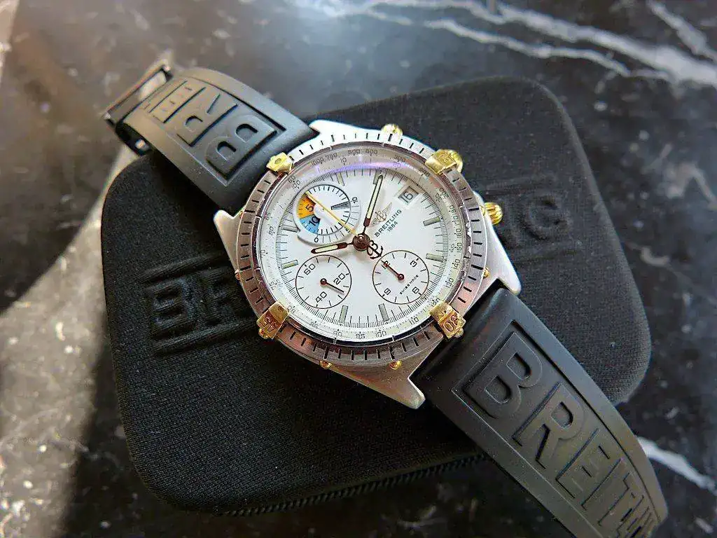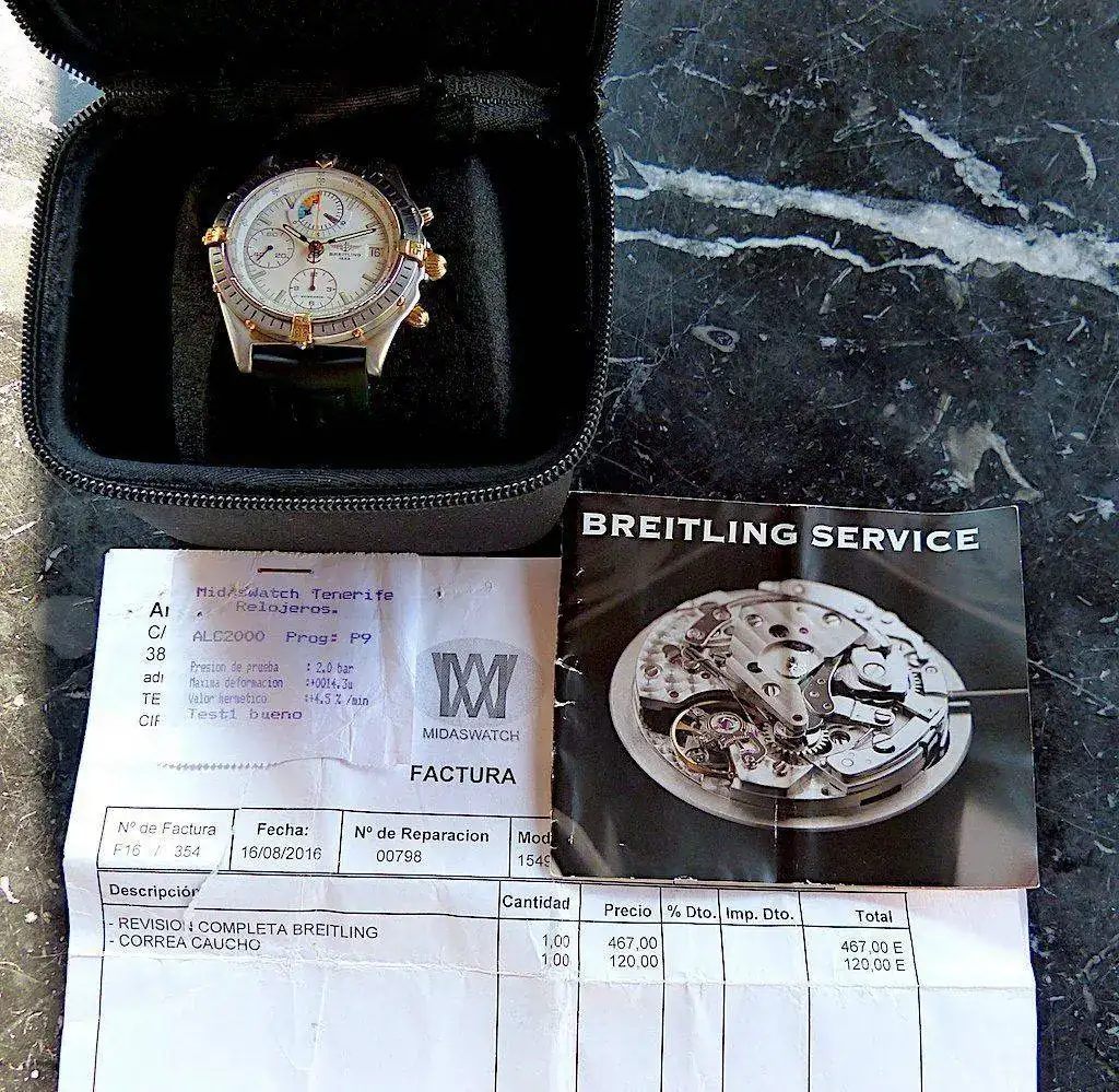 Breitling Chronomat en su rara edición Yachting con esfera blanca y contador de regata. El reloj está en muy buen estado general con revisión oficial de 2016, factura, manual, estuche de servicio y un caucho original prácticamente sin uso.