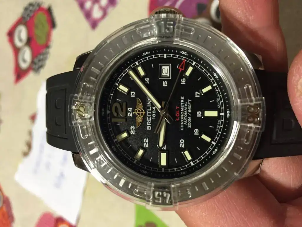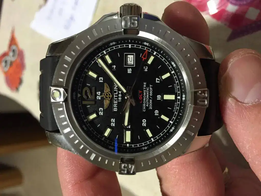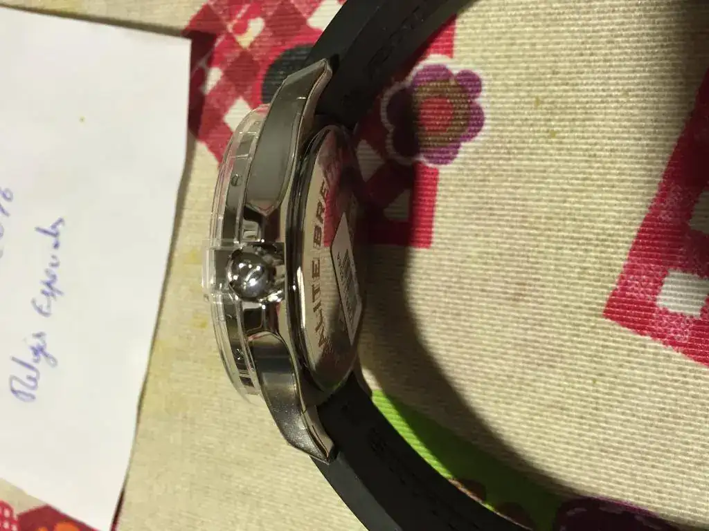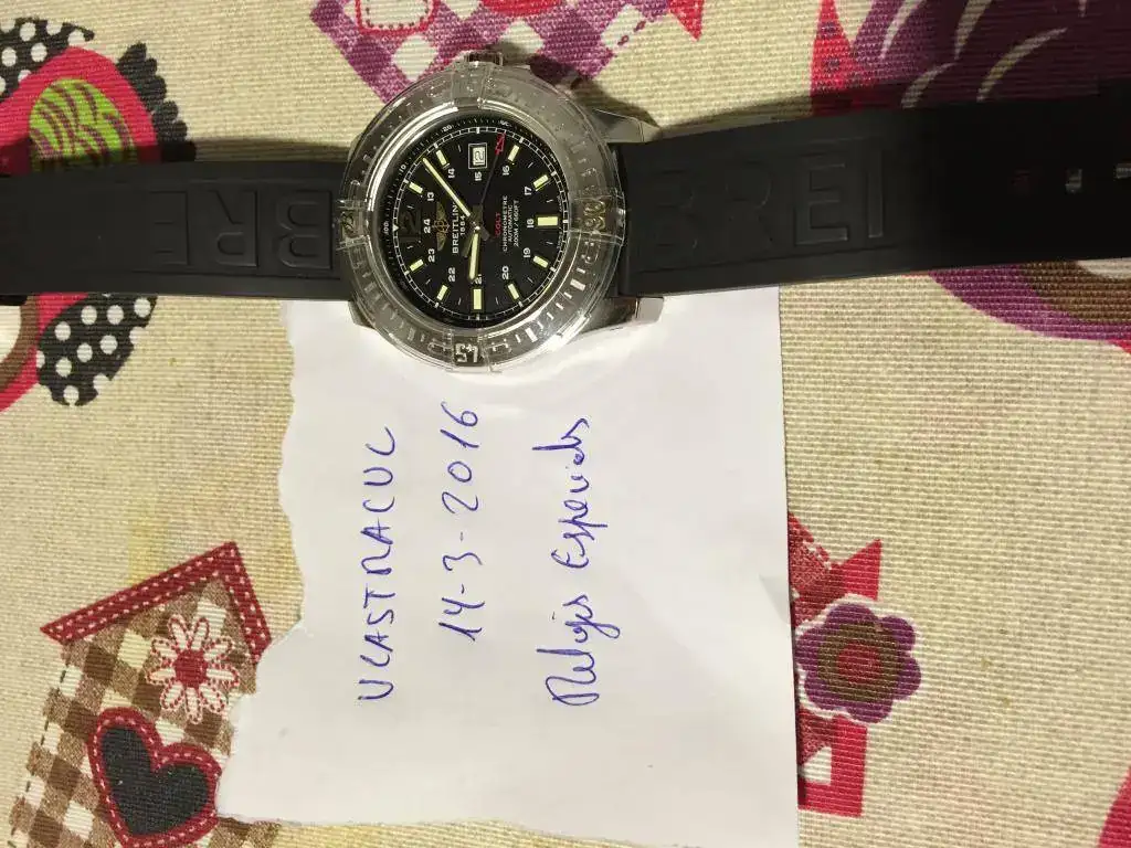 Buenas noches a todos/as,saco solo para venta este fallido regalo a un compañero de trabajo,no le gusta el bisel de acero lo prefiere en color negro...el problema es que los Breitling Colt solo se hacen así...habrá que buscar otro reloj con bisel negro de similar calidad y precio.Bueno el reloj está completamente nuevo(solo se lo puso 5min en la muñeca)tiene todos sus plásticos colocados en la carrura,tapa trasera y el protector plástico del bisel(lo único que le falta es el plástico de la hebilla del ardillon y tiene unas leves microrayas en el,tampoco tiene el plástico del cristal del reloj que esta impoluto) no tiene ninguna marca por ningún lado,es como si lo comprases en la relojería tu...solo que a un muy buen precio.Una última cosa...salgo de viaje mañana y en caso de que alguno lo quisierais comprar,solo lo podría enviar el jueves por la mañana(el viernes salgo de viaje de nuevo)un cordial saludo y agradecer a Goldoff por autorizarme a publicar este anuncio.