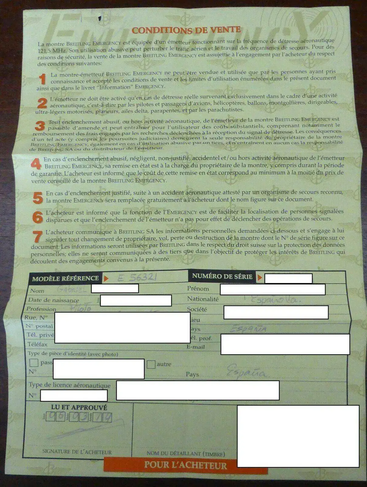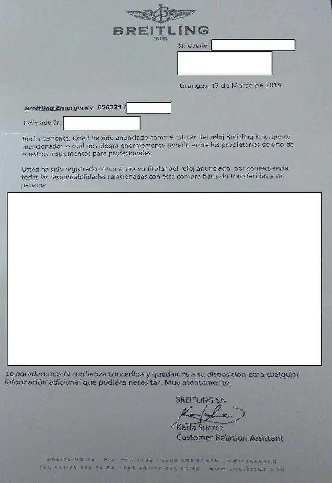 La documentación de esta herramienta aeronáutica está totalmente en regla y a mi nombre, como sabéis estos relojes deben estar vinculados a una persona física en teoría un piloto con su num de licencia, pero Breitling no pone ningún problema en pasar la documentación a otra persona aunque no sea piloto, de forma gratuita, sobre lo de la documentación hay que hablarlo, es importante cambiar en la base de datos de Breitling la identidad del nuevo propietario. Ya que si entrego el reloj, y por lo que sea el nuevo propietario lo activa sin emergencia real, pues al que van a empapelar con una multa de decenas de miles de euros más posible pena de cárcel va a ser a mi. Por eso es importante tener claro lo del cambio de propietario.